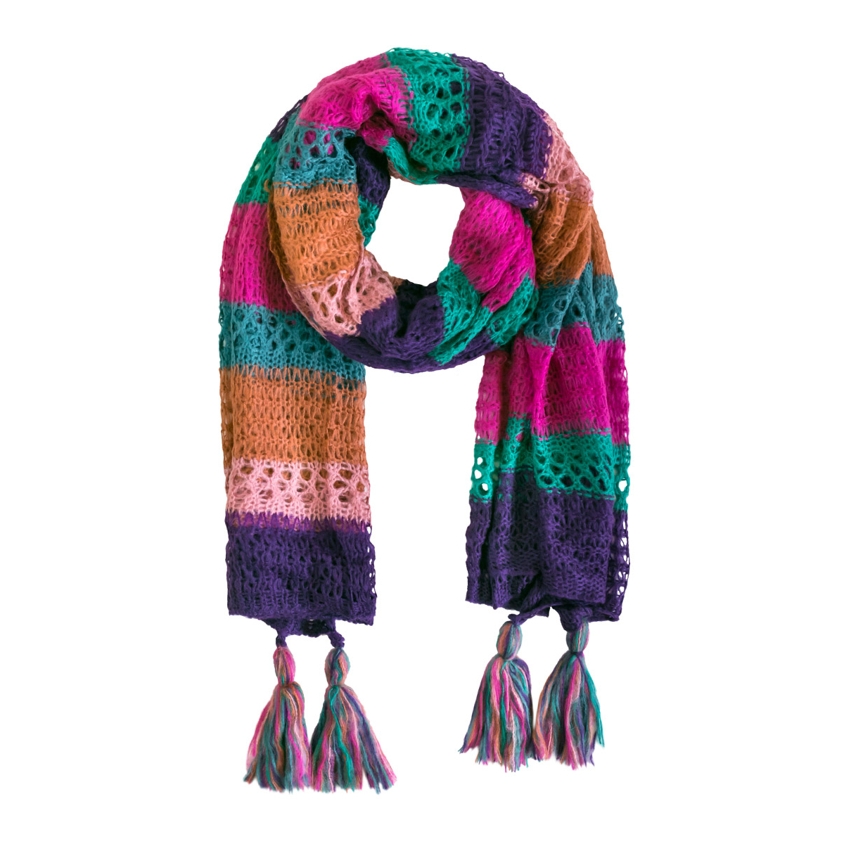 Apportez style et confort à vos tenues avec cette écharpe rayée en laine ajourée. Ses couleurs harmonieuses dans les tons de vert, violine, marron et fuchsia en font un accessoire tendance, facile à associer au quotidien. Légère mais chaude, elle est idéale pour la mi-saison comme pour l’hiver.