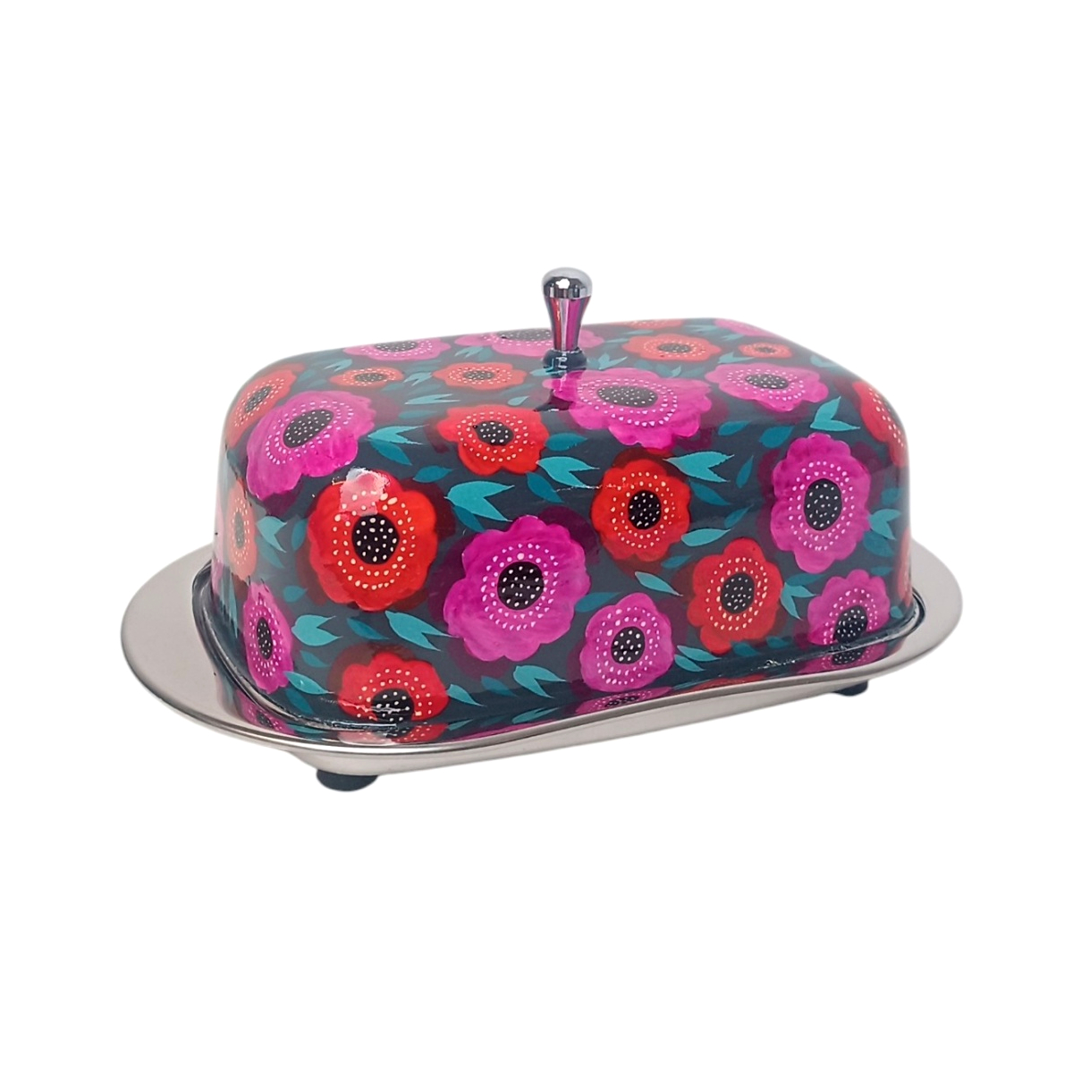 Sa cloche en inox, peinte à la main sur un fond vert profond, est décorée de grandes fleurs fuchsia et orangées qui ressortent joliment. Pratique pour conserver et présenter le beurre au quotidien, ce beurrier coloré apporte tout de suite du pep’s à vos petits-déjeuners. Chaque pièce est peinte à la main, les motifs peuvent donc légèrement varier et rendre votre modèle unique.