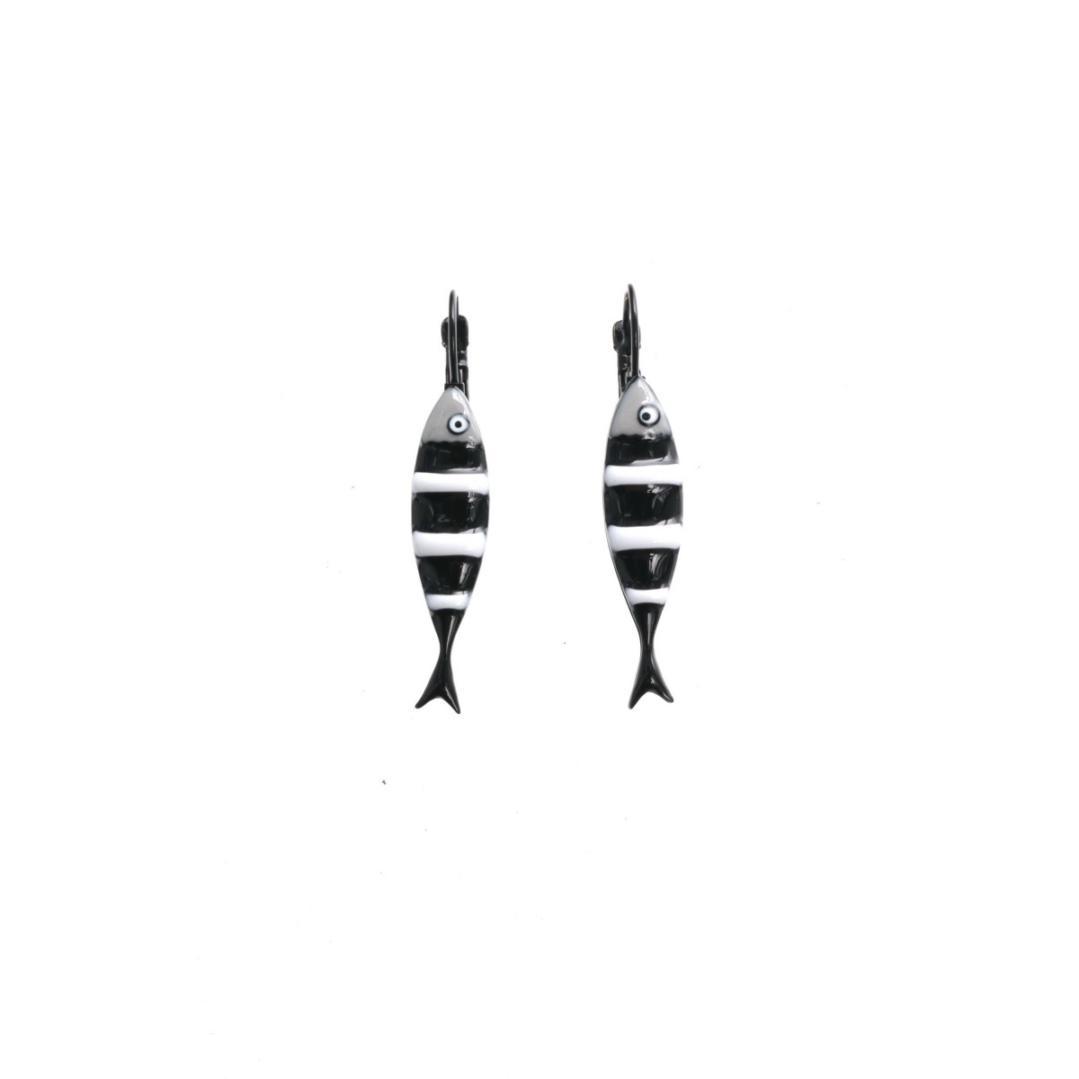 Boucles d'oreilles émaillées , composées d'une petite sardine noires  (dos émaillé uni noir) .