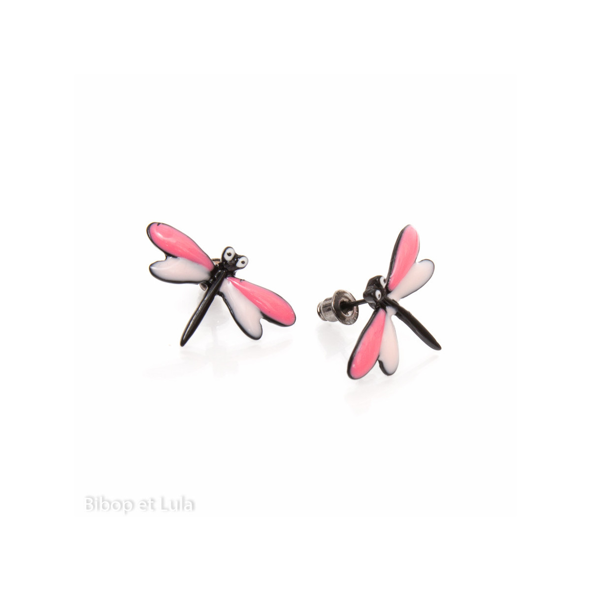 Boucles d'oreilles clous émaillées , représentant une petite libellule rose (dos émaillé noir) .