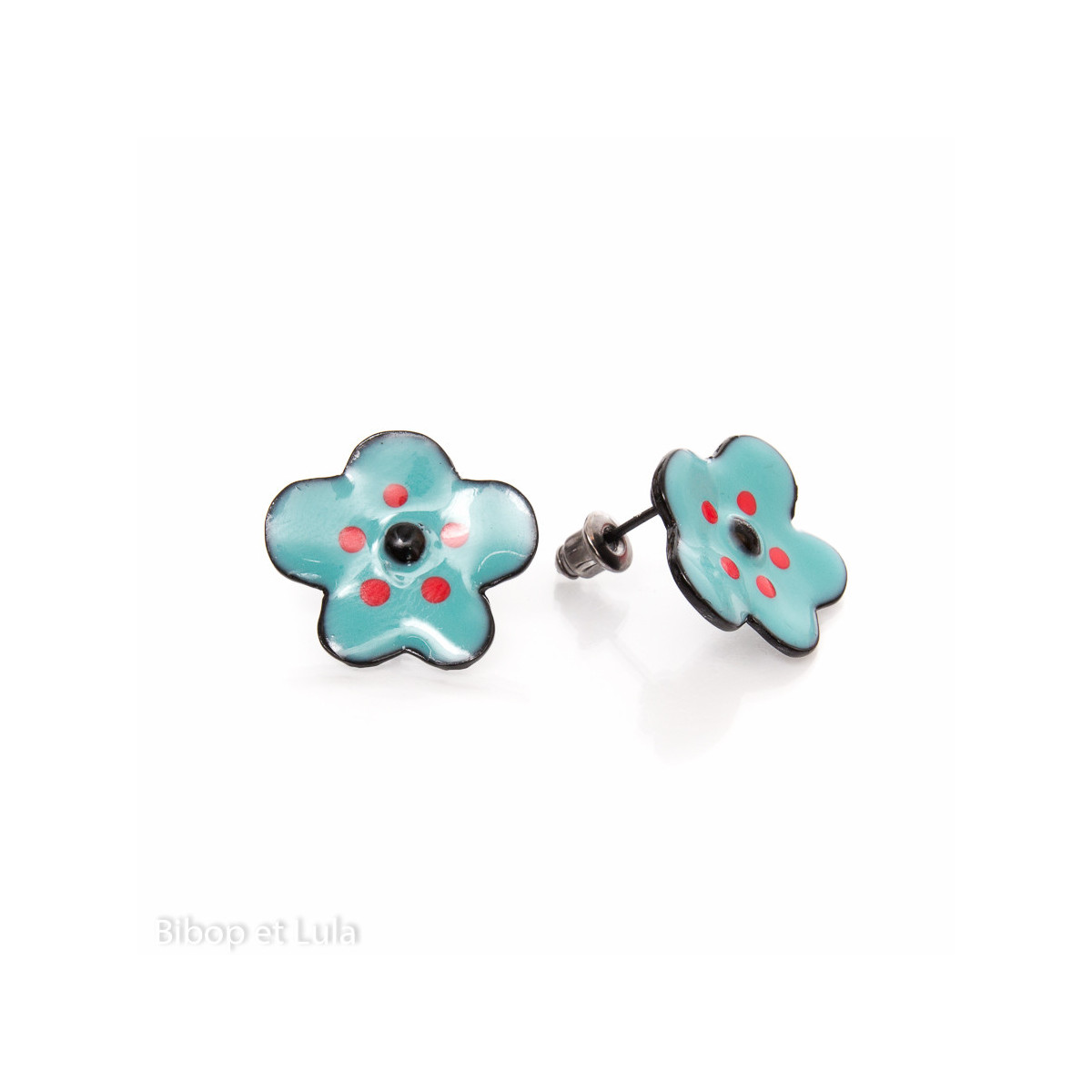 Boucles d'oreilles clous émaillées , représentant une petite fleur bleue (dos émaillé noir) .