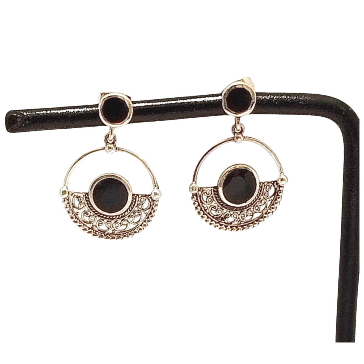 Ces boucles d’oreilles en argent avec pierre noire séduisent par leur design raffiné et leur allure bohème chic. La forme ronde ajourée apporte de la légèreté au bijou, tandis que la pierre noire centrale crée un contraste élégant avec l’éclat de l’argent. Ce modèle habille facilement le visage et apporte une touche de caractère à une tenue sobre comme à une silhouette plus habillée.