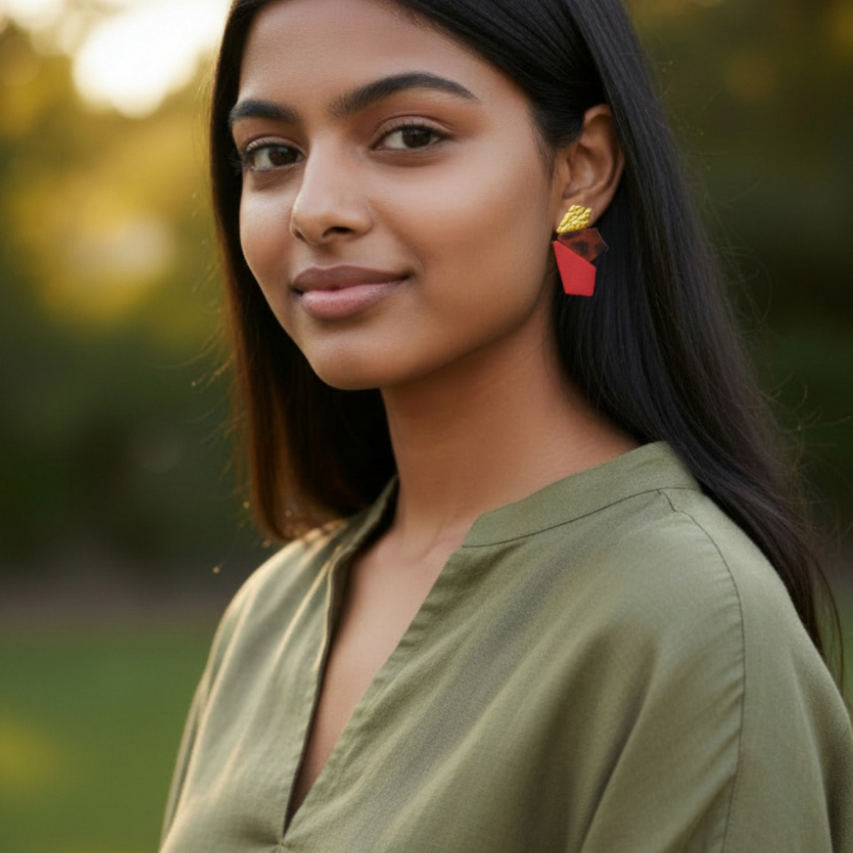 Affirmez votre style avec ces boucles d’oreilles géométriques en cuir rouge, sublimées par une pièce en peau teinté et un éclat doré effet feuille d’or.