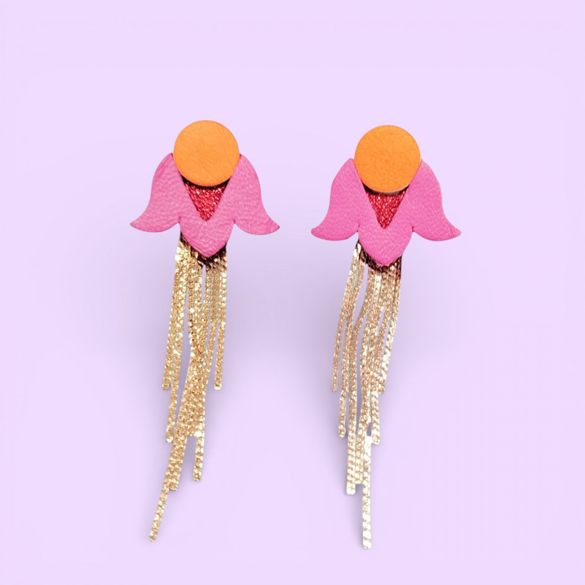 Les boucles d’oreilles Calypso sont une véritable explosion de couleur et de lumière. Leur design associe un clou rond orange lumineux, une forme florale rose structurée et un détail central rouge texturé qui apporte profondeur et contraste.