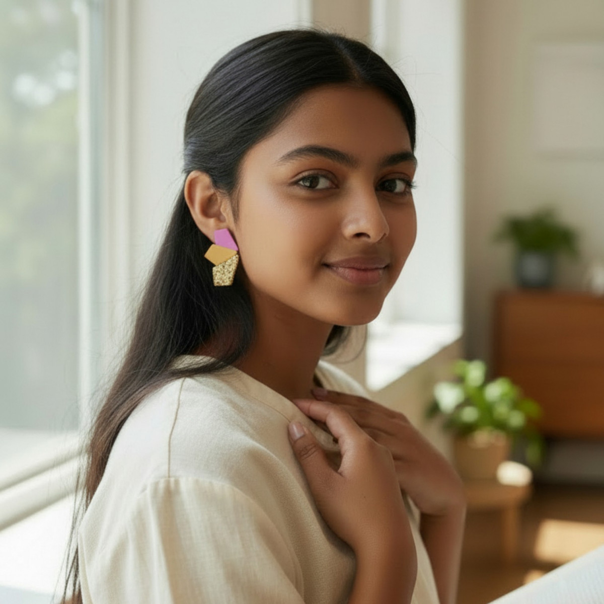Affirmez votre style avec ces boucles d’oreilles en cuir géométriques rose et jaune, sublimées par une pièce texturée effet pailleté doré.