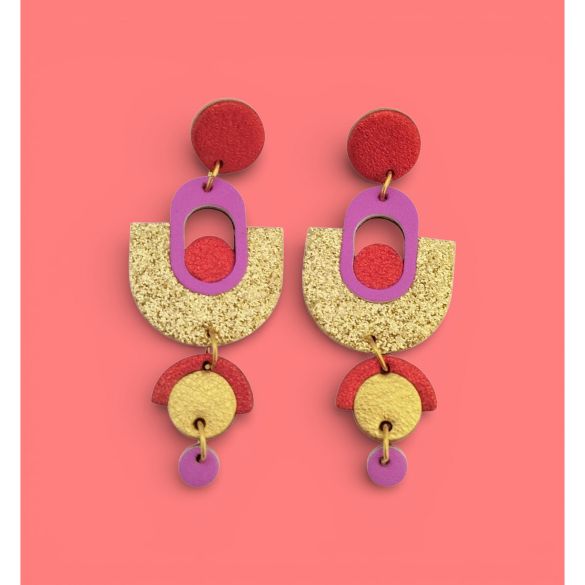Boucles d’oreilles graphique cuir rouge doré paillette