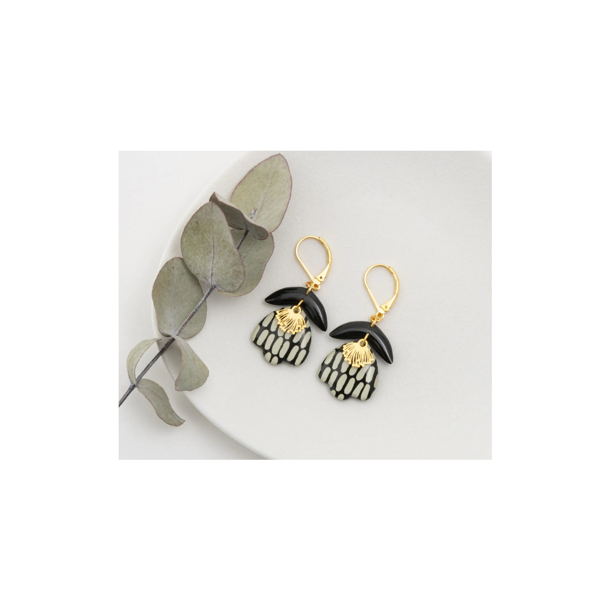 Perle de résine réalisée avec une résine époxy apportant finesse, brillance et légèreté. Motif papier résiné des deux côté ( dos uni noir ).