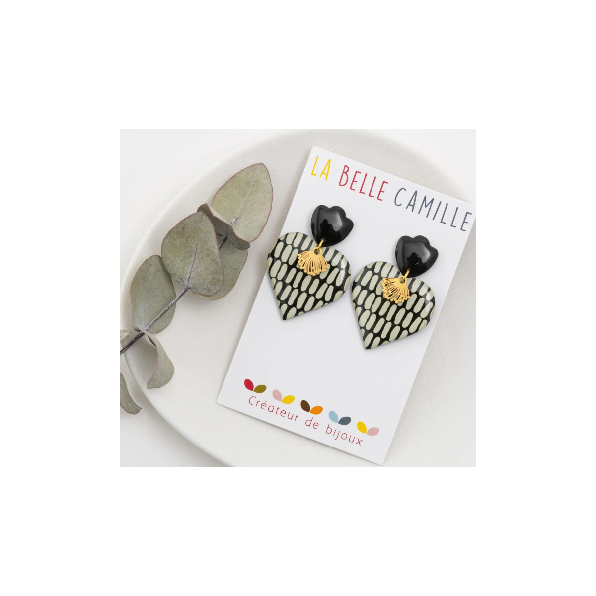 BijouX composé de perles de papier résiné , et de pampilles montées sur attaches dormeuses rondes.