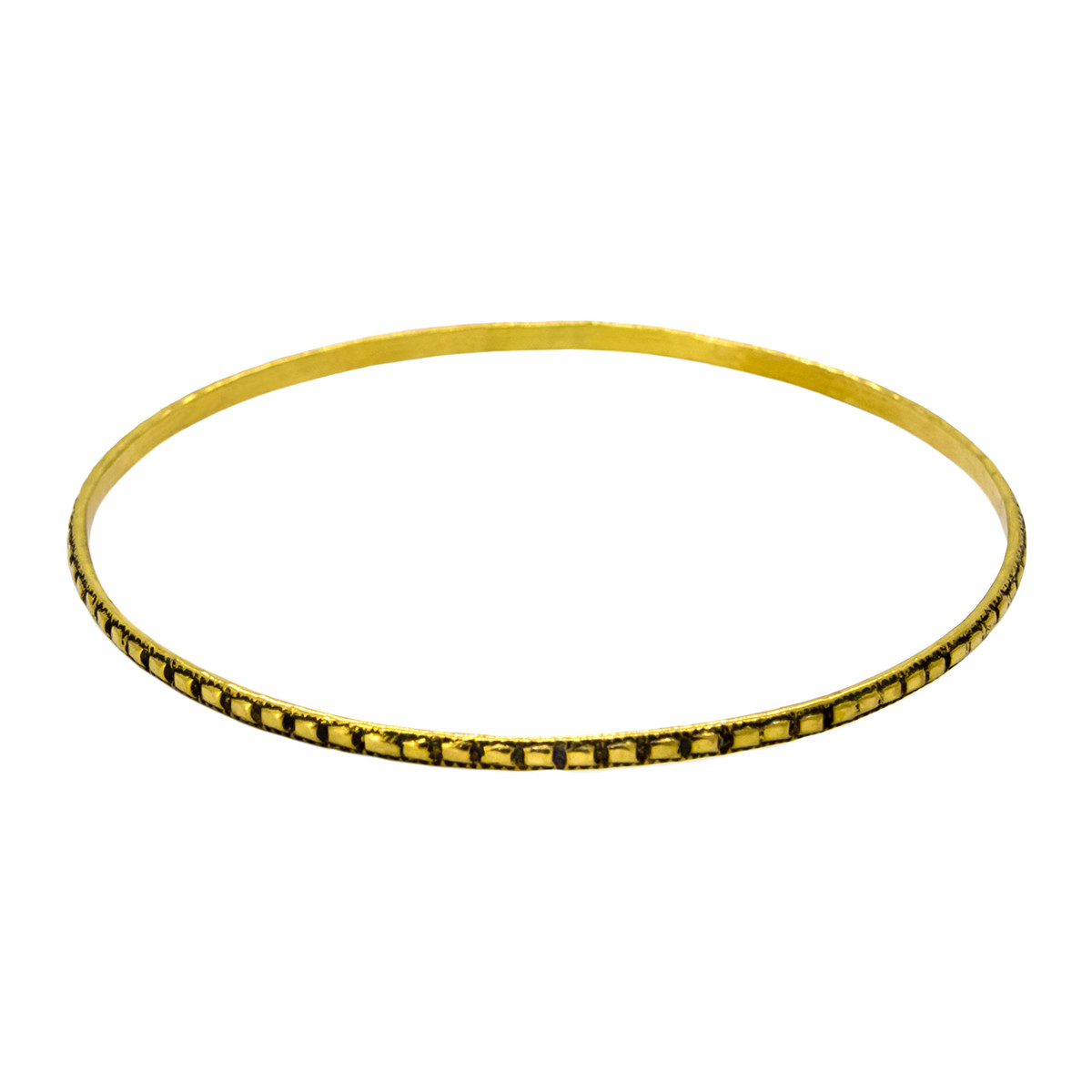 Minimaliste et raffiné, ce bracelet jonc fin en laiton doré séduit par son design discret et son motif géométrique délicatement gravé.