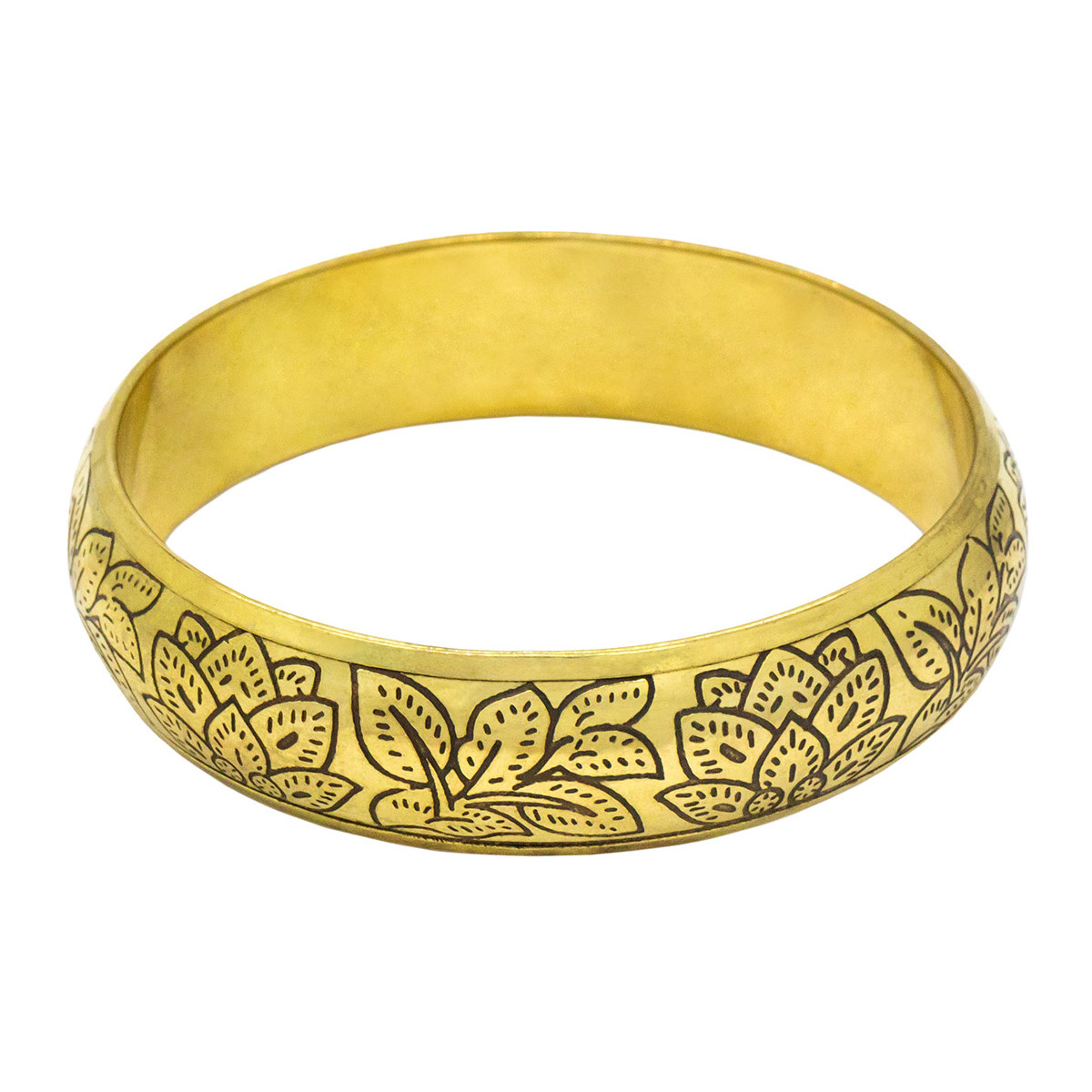 Sublimez votre poignet avec ce bracelet jonc en laiton doré, finement décoré de gravures florales inspirées de la nature.