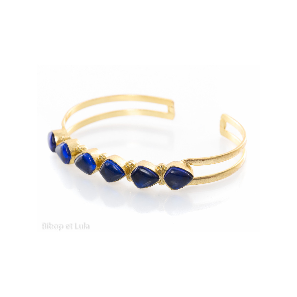 Jolie manchette, bracelet en laiton doré ajustable à votre poignet. Son bracelet avec ses pierres fines bleues confère un style chic et élégant. Il peut aisément s'associer à d'autres bracelets fins.