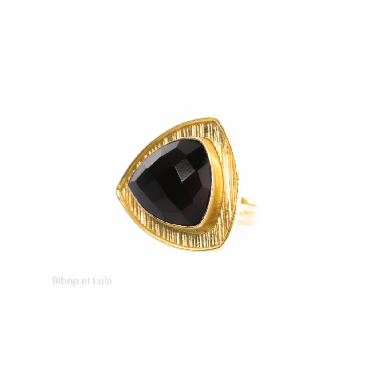 Elégante bague en laiton doré triangle avec sa pierre onyx noire facettée.