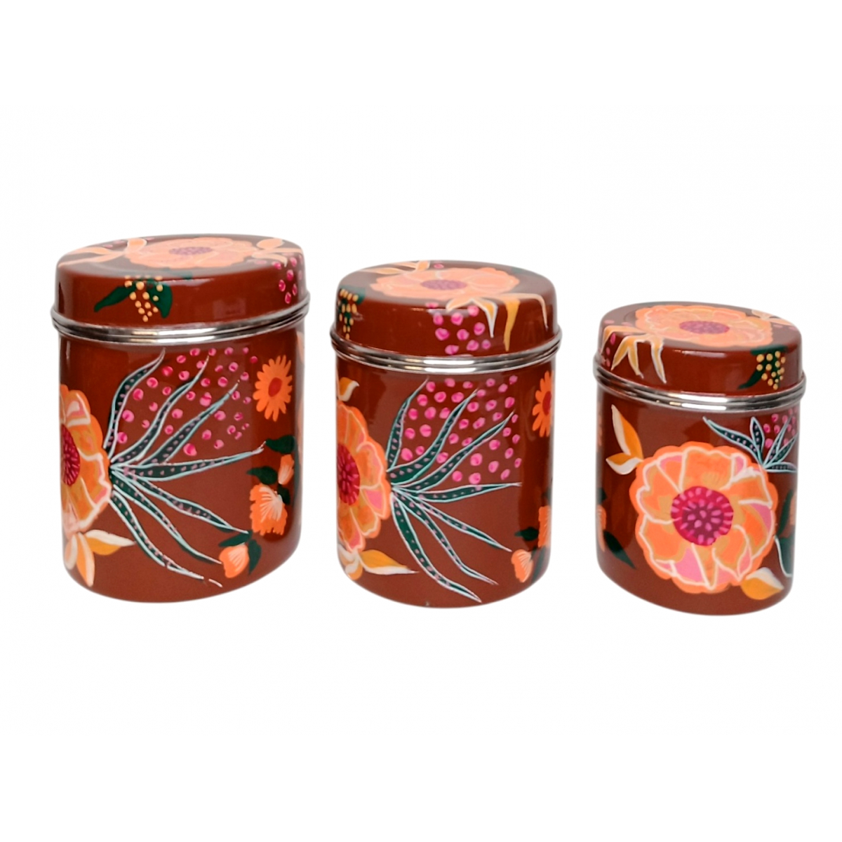Apportez une touche de chaleur à votre cuisine avec notre ensemble de 3 boîtes gigognes Mandi en inox. Leur fond brun est décoré de grandes fleurs orangées et de feuillages colorés, entièrement peints à la main.
