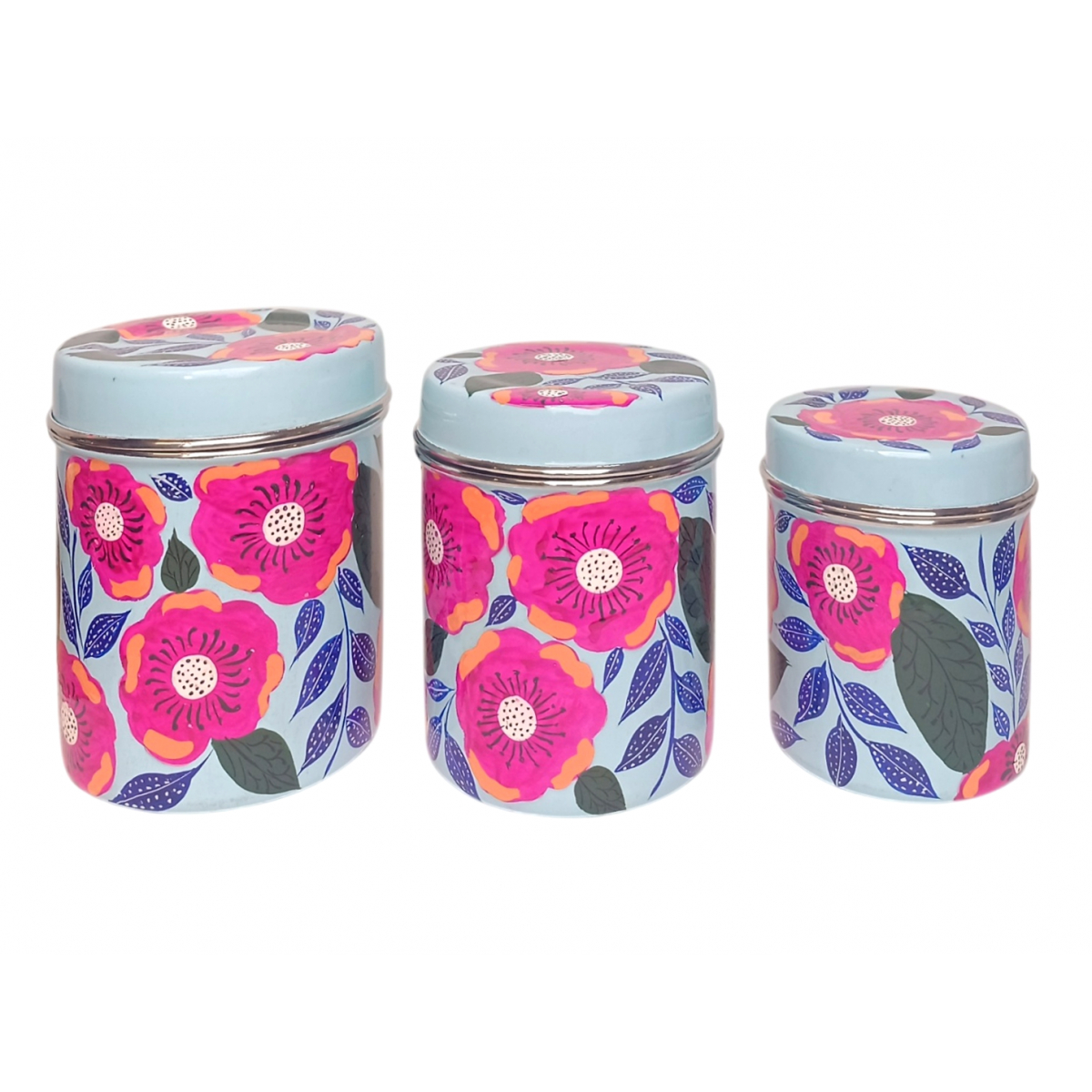 Donnez du pep’s à votre cuisine avec notre ensemble de 3 boîtes gigognes Salem en inox. Sur un fond bleu ciel, de grandes fleurs fuchsia et des feuilles bleues et vertes, peintes à la main, composent un motif frais et coloré.