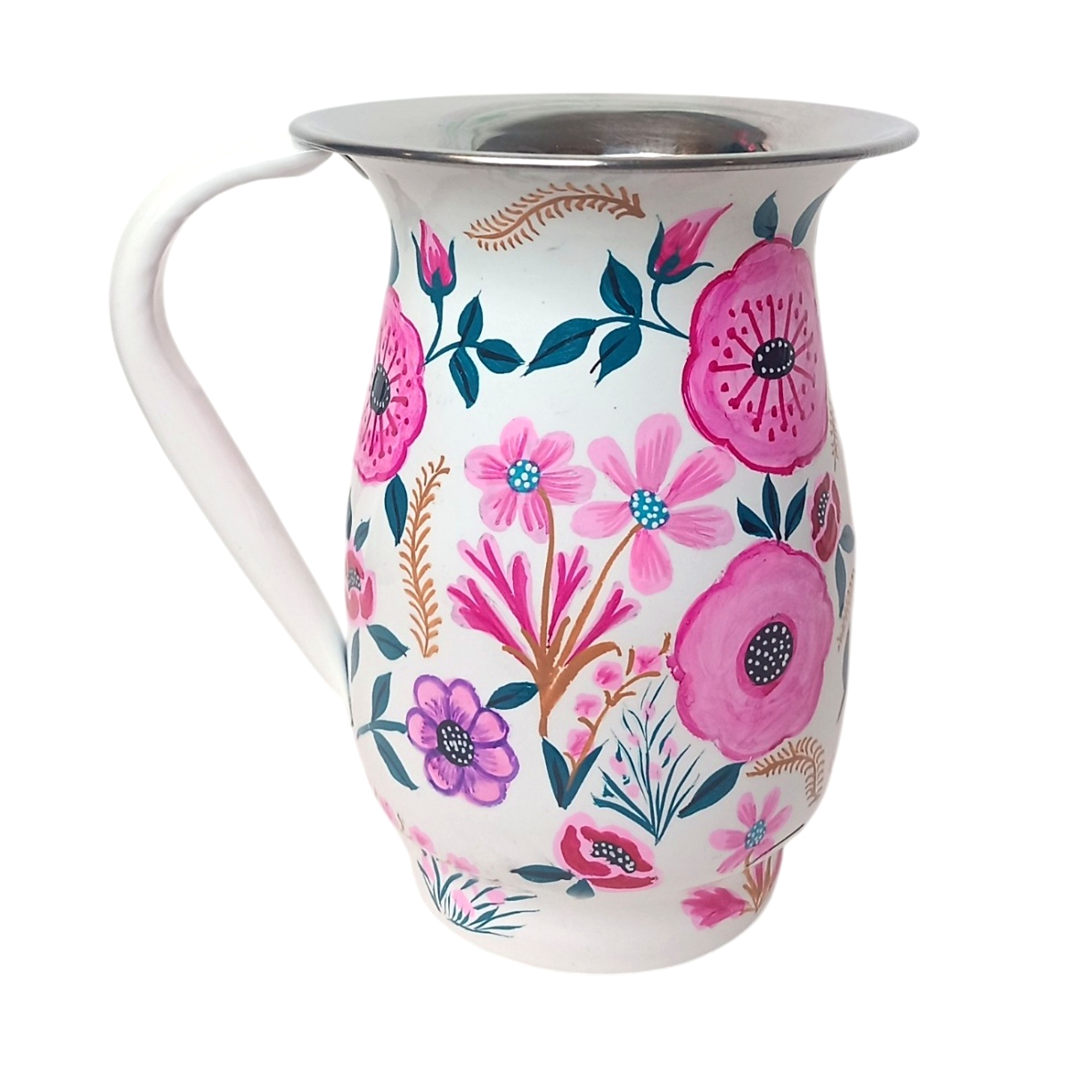 Le pichet Kandla en inox peint à la main séduit par son fond blanc ponctué de fleurs roses et violettes. Son motif délicat et coloré en fait un compagnon chaleureux pour servir l’eau ou les jus, au quotidien comme lors de vos brunchs et goûters.