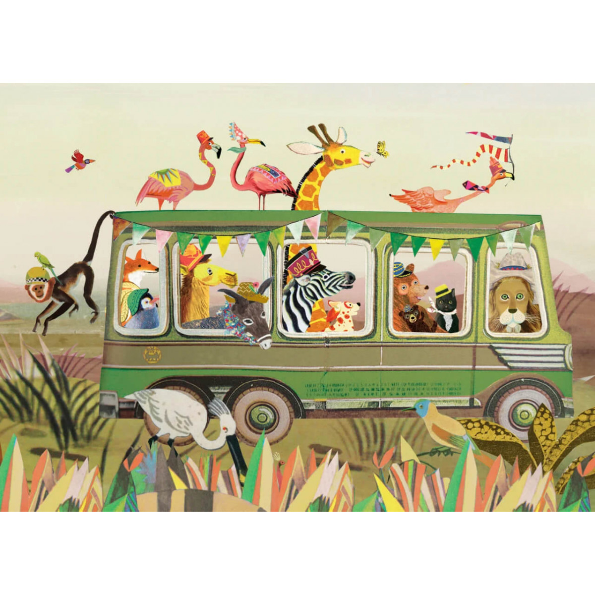 Bienvenue dans le monde sauvage du "Safari Afrique", une carte postale qui vous transporte au coeur de la savane africaine, à bord d'un bus safari rempli d'animaux du monde entier.