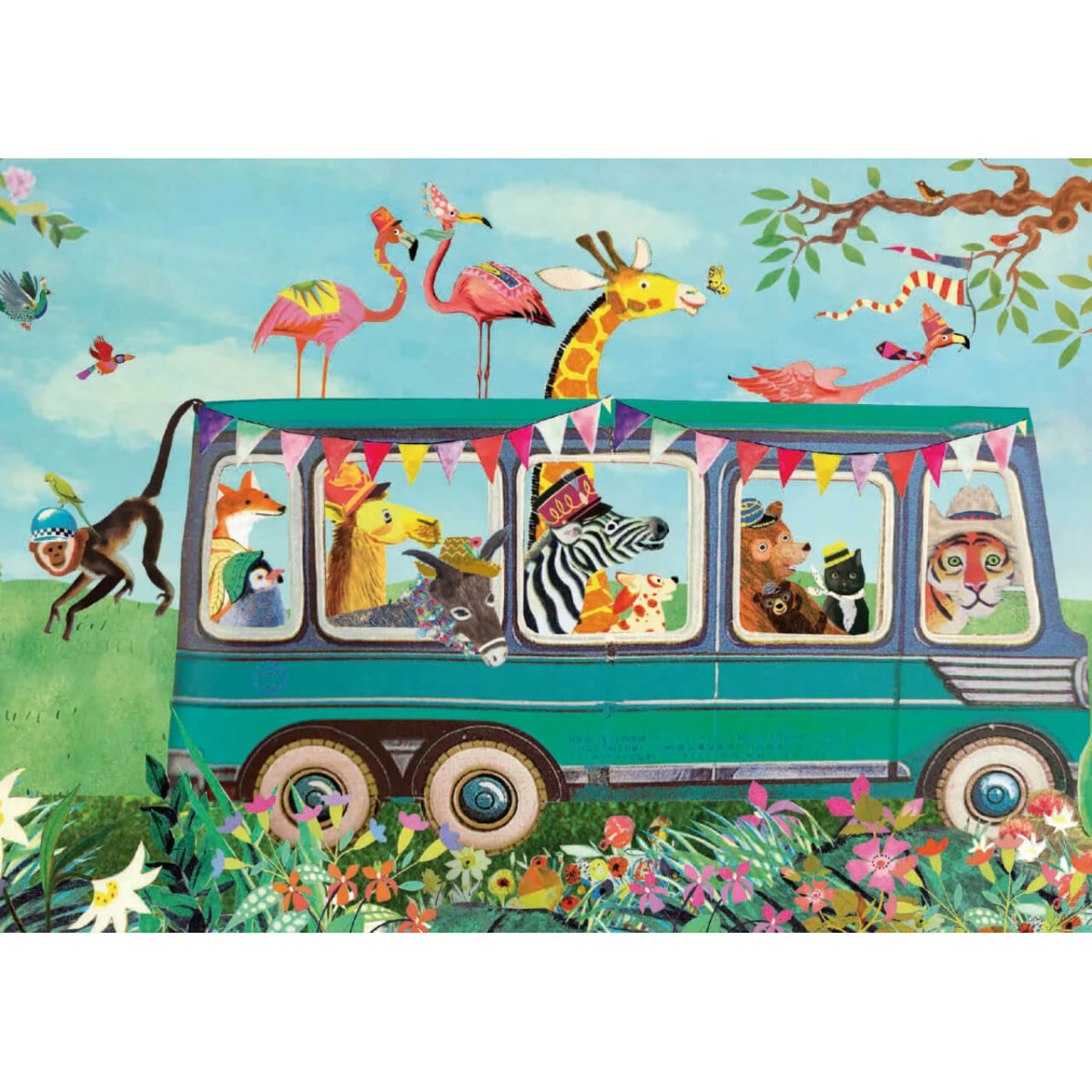 Bienvenue dans l'aventure en plein air du "Safari Nature", une carte postale qui vous transporte à travers une nature luxuriante, avec un bus safari bleu vibrant. Imaginez un bus coloré sillonnant à travers un environnement verdoyant, rempli d'une variété captivante d'animaux et de végétation.