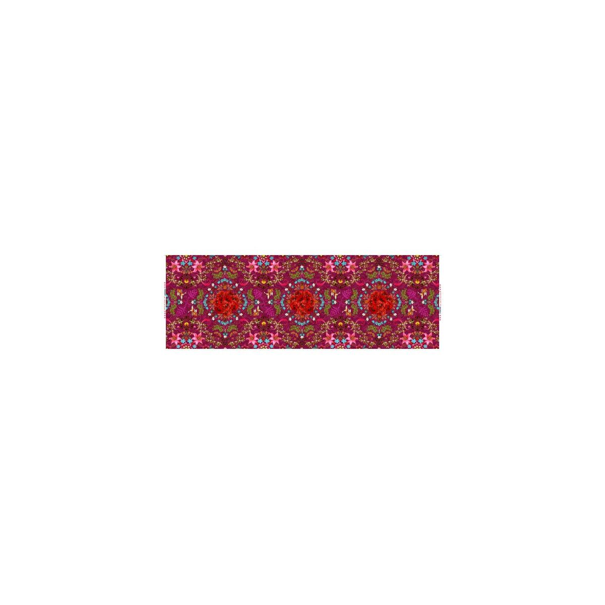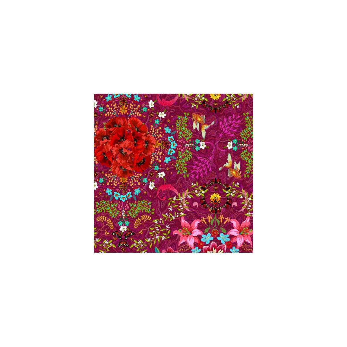 Coquelicots, poissons rouges et lys roses se marient en un tissu original à la composition symétrique. Il se coordonne aux dessins Malabar et Lisboa.