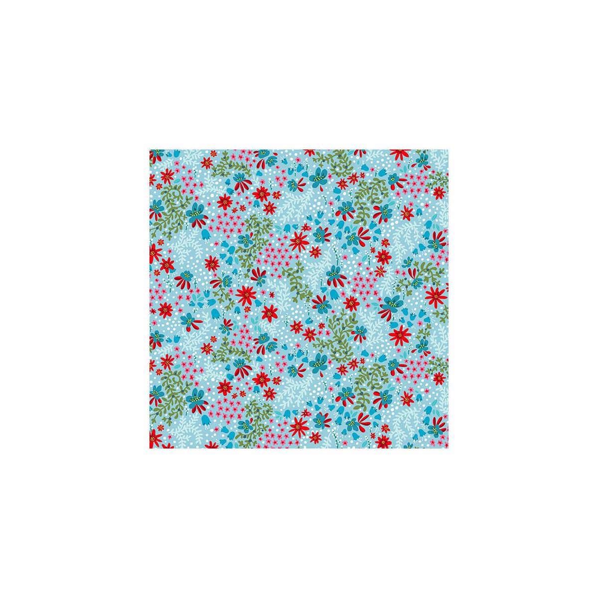 Joli coton bleu ciel, clairsemé de petites fleurs bleues, roses et rouges.