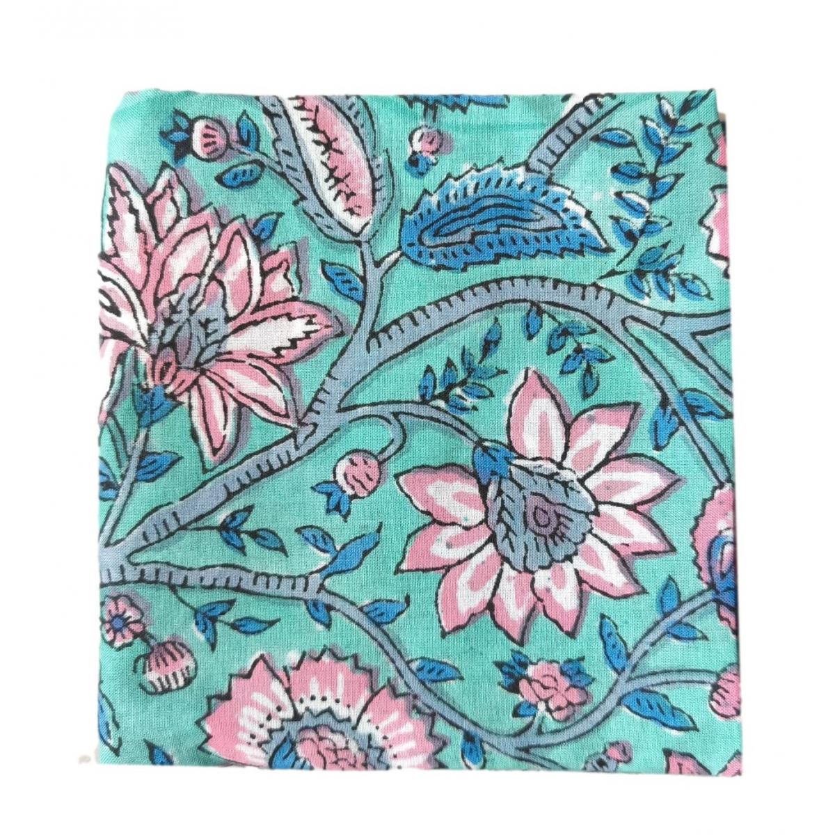 Ajoutez une touche florale à vos créations avec ce coupon de tissu indien block print Arjun , aux motifs de fleurs roses sur fond turquoise