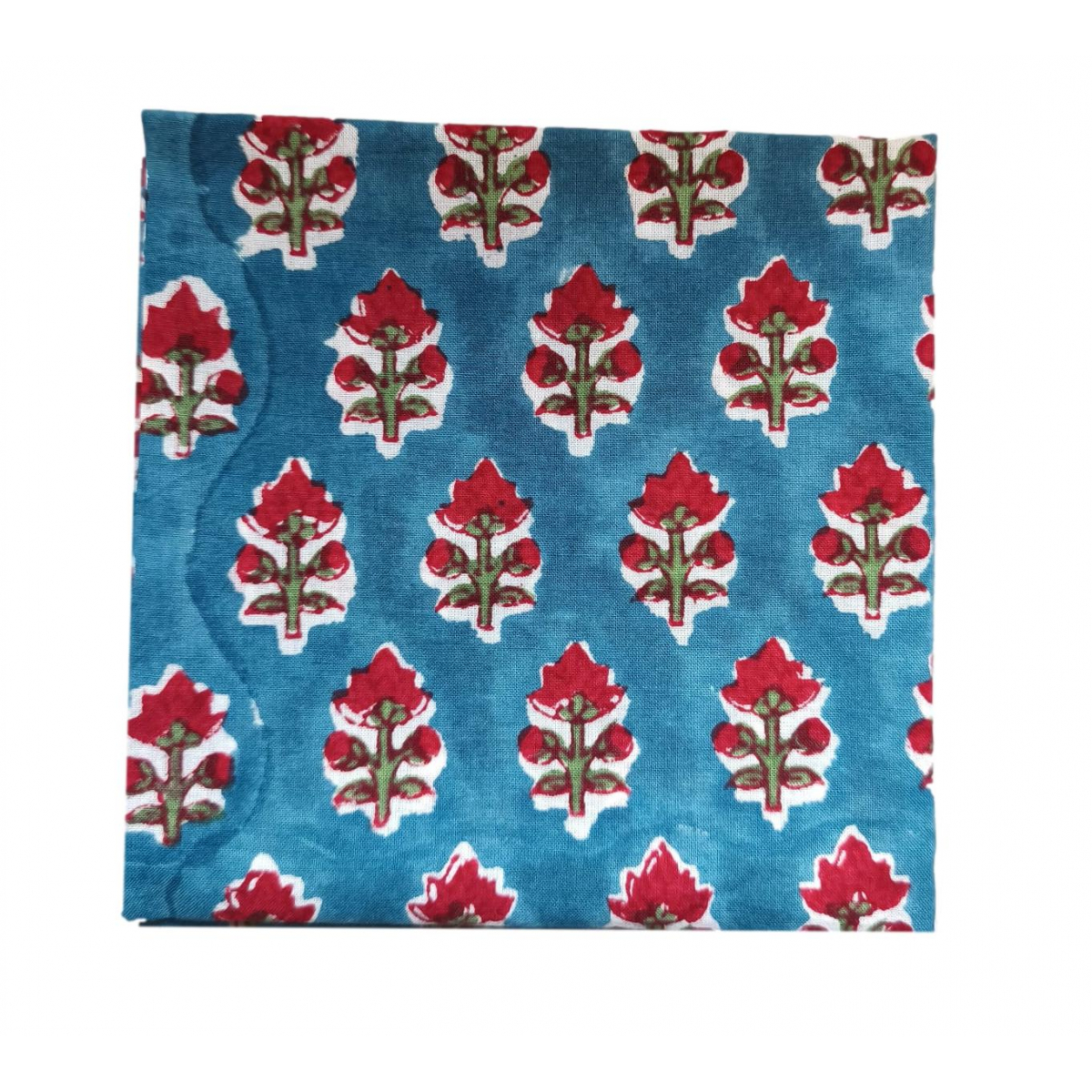 Ajoutez une touche florale à vos créations avec ce coupon de tissu indien block print Rakesh , aux motifs de fleurs rouges sur fond bleu