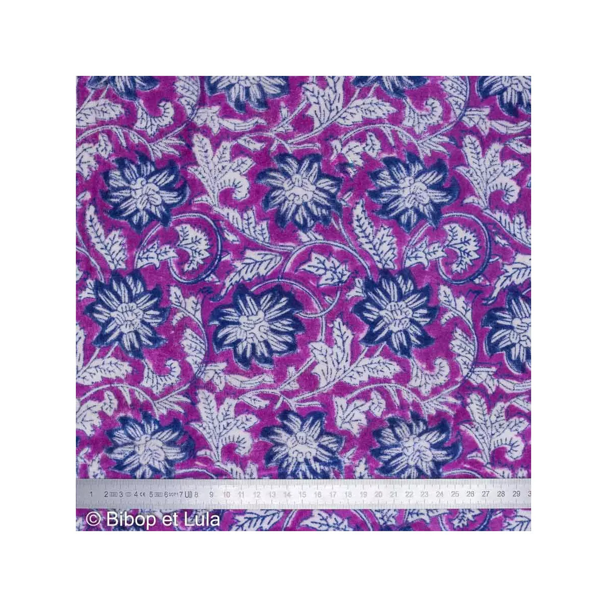 Un fond mauve qui fait ressortir un joli motif floral bleu et blanc.