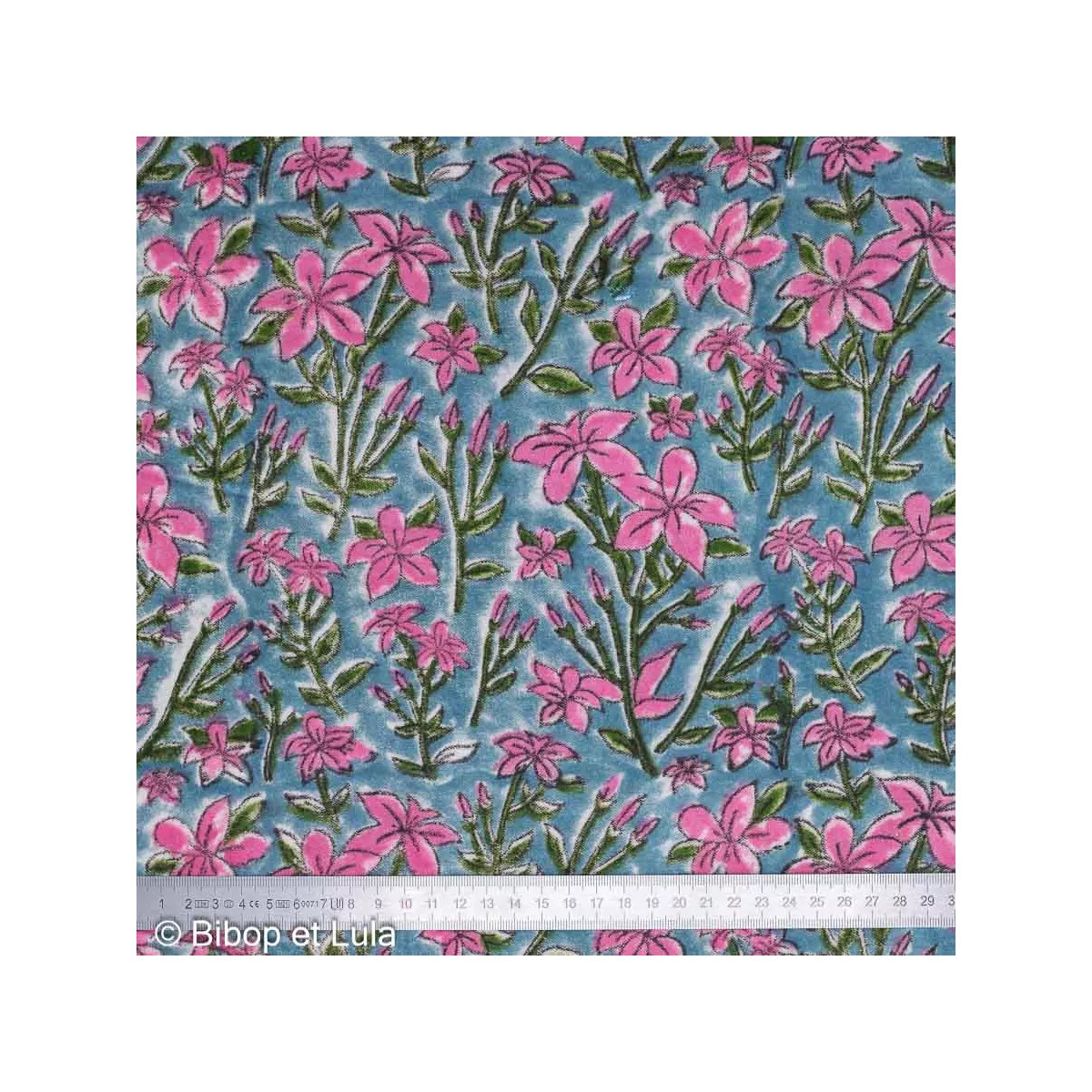 Un fond bleu grisé qui fait ressortir un joli motif floral rose et vert.