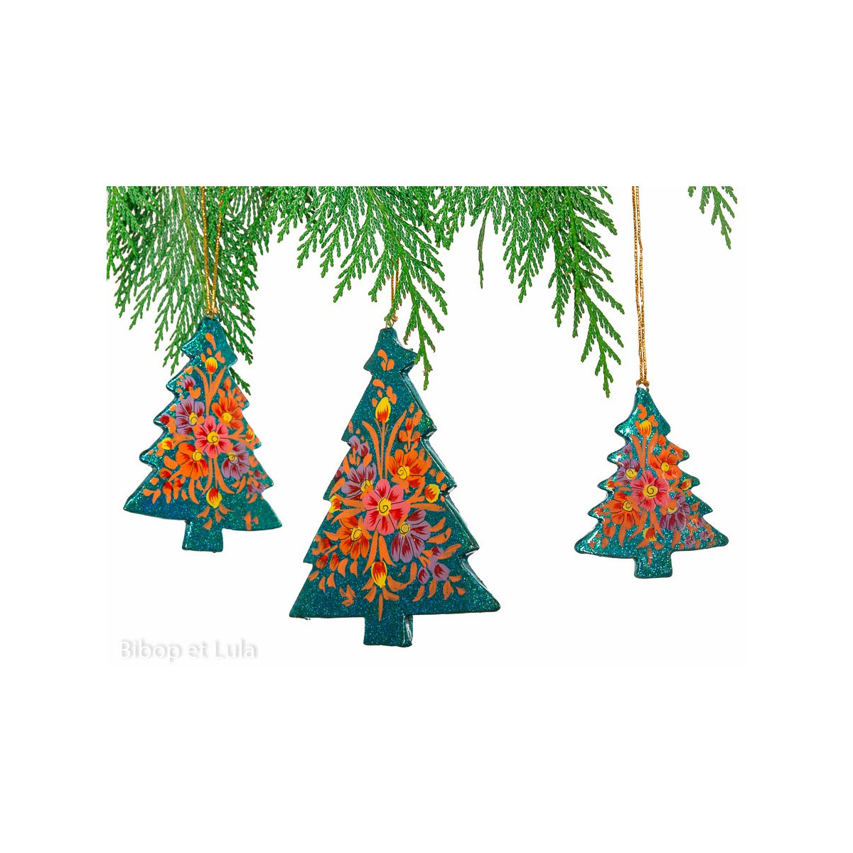 Décoration à suspendre en forme de sapin colorée avec un motif fleuri qui égaiera votre intérieur en lui apportant couleur et chaleur. Idéal pour décorer votre sapin de Noël.