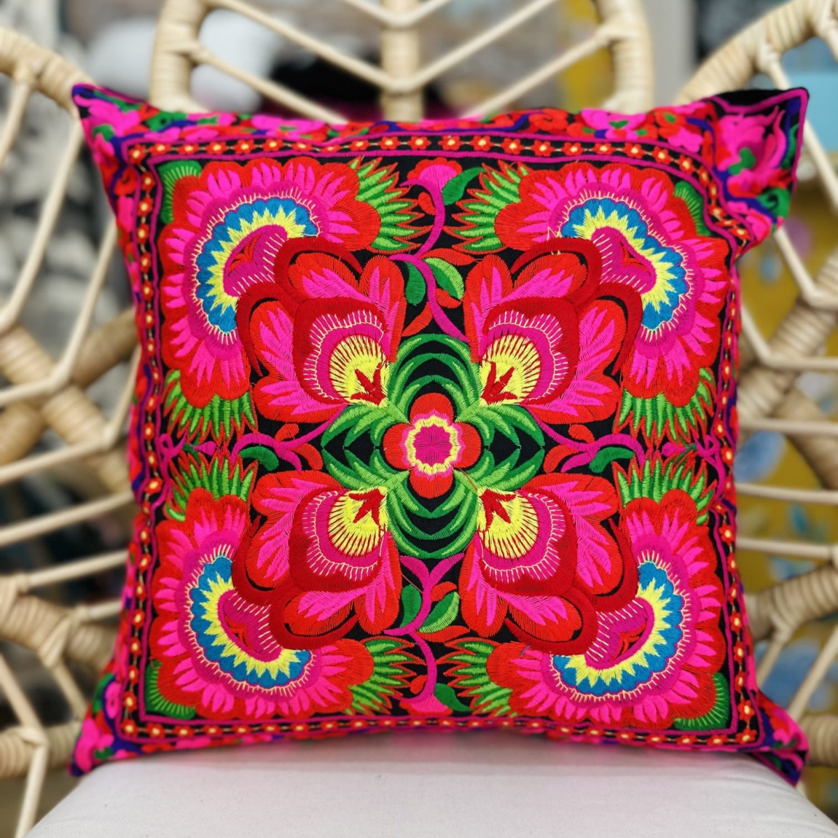 Housse de coussin brodé coloré, fond noir fleurs rouge, jaune, vert, bleu
