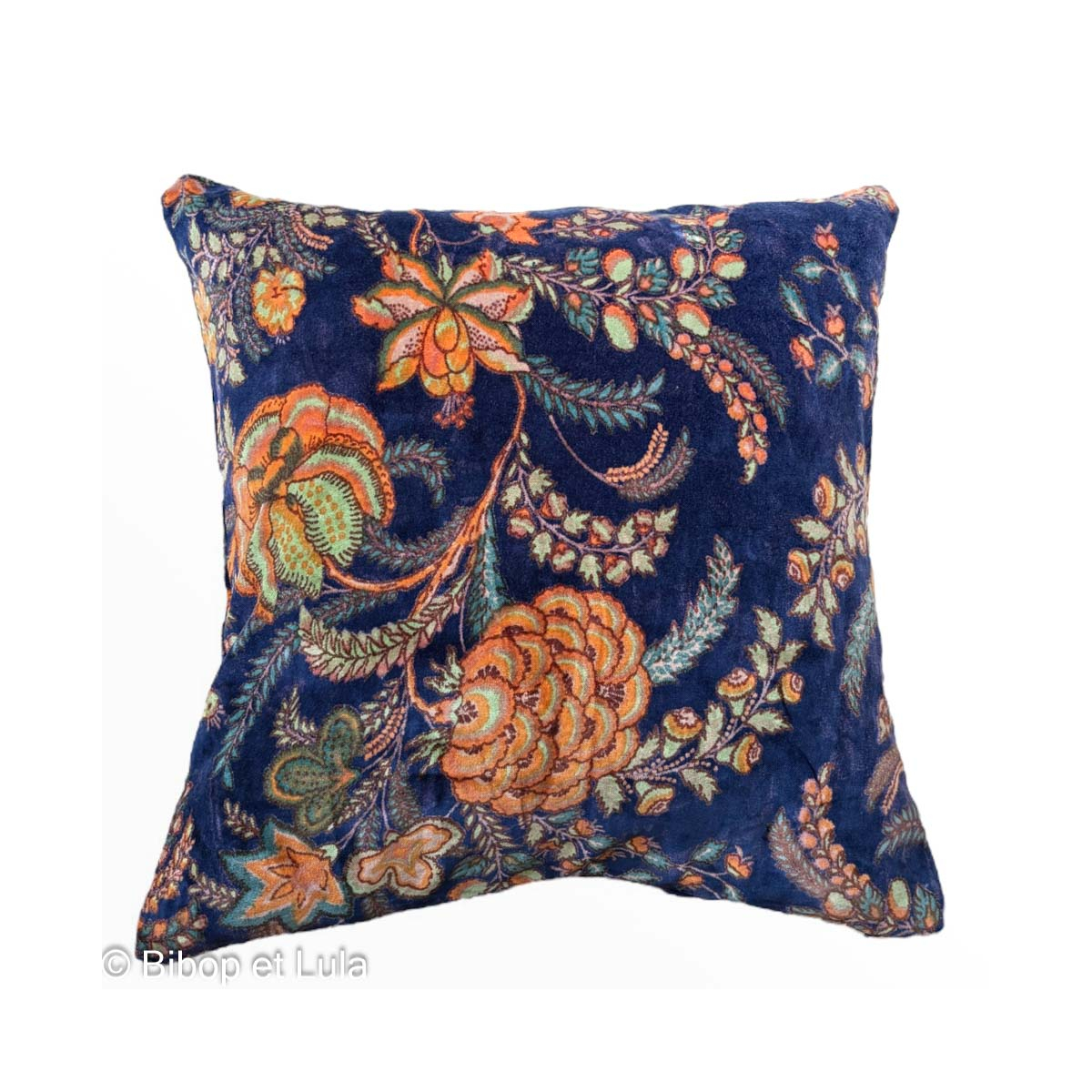 Apportez une touche d’élégance et de chaleur à votre intérieur avec cette magnifique housse de coussin en velours bleu nuit imprimé Calie