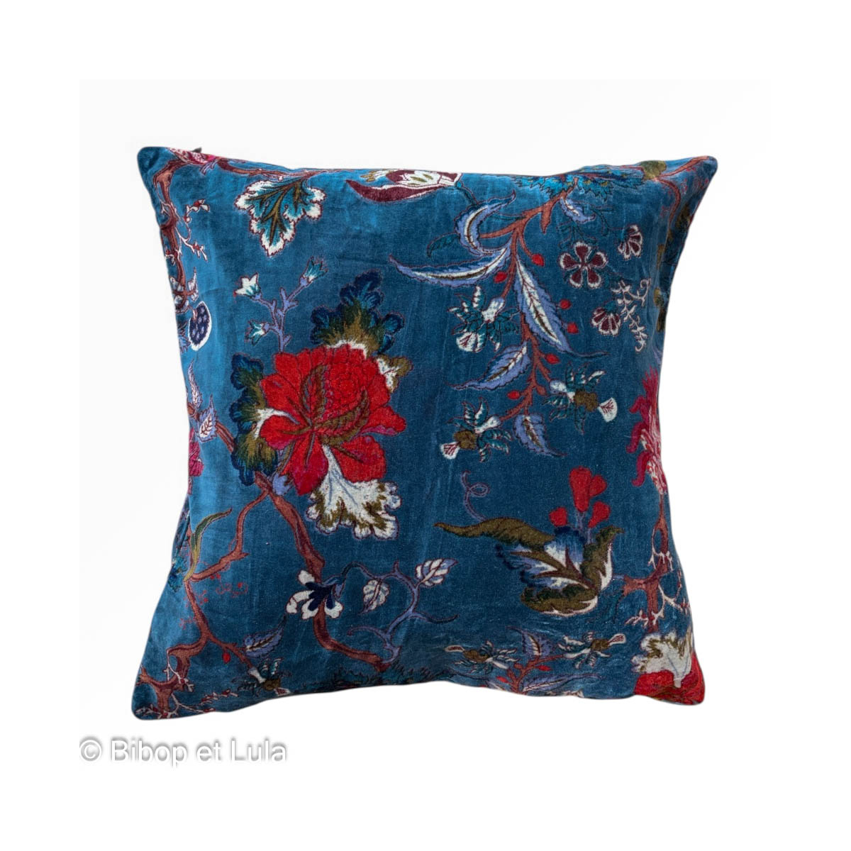 Housse de coussin en velours bleu indigo imprimé fleuri