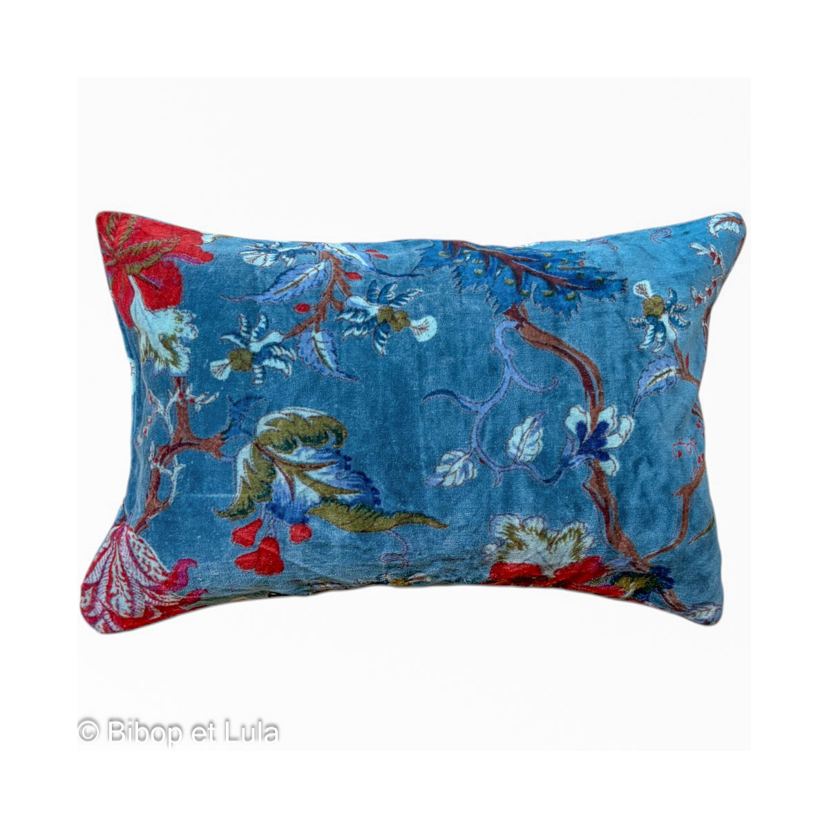 Housse de coussin en velours petit rectangle bleu indigo imprimé fleuri