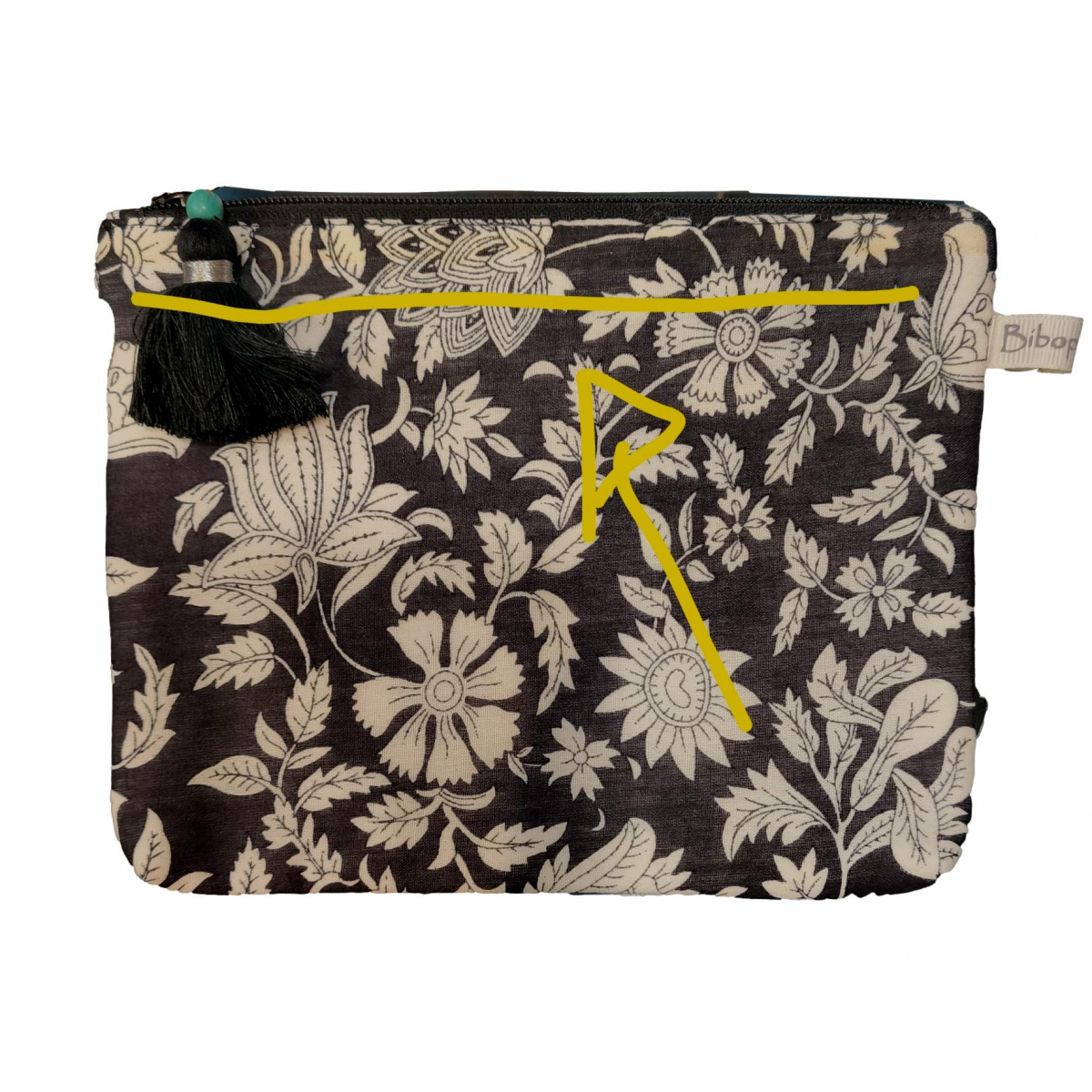 Cette pochette est déstockée car elle présente une légère tache jaune le long de la fermeture éclaire .