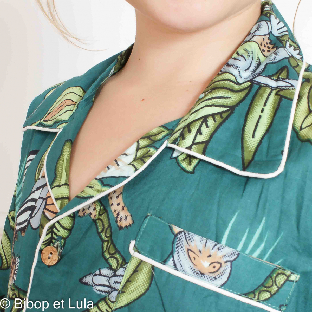 Les finitions avec un joli biais et les boutons en bambou témoignent d’un soin particulier apporté aux détails, alliant esthétique et durabilité.