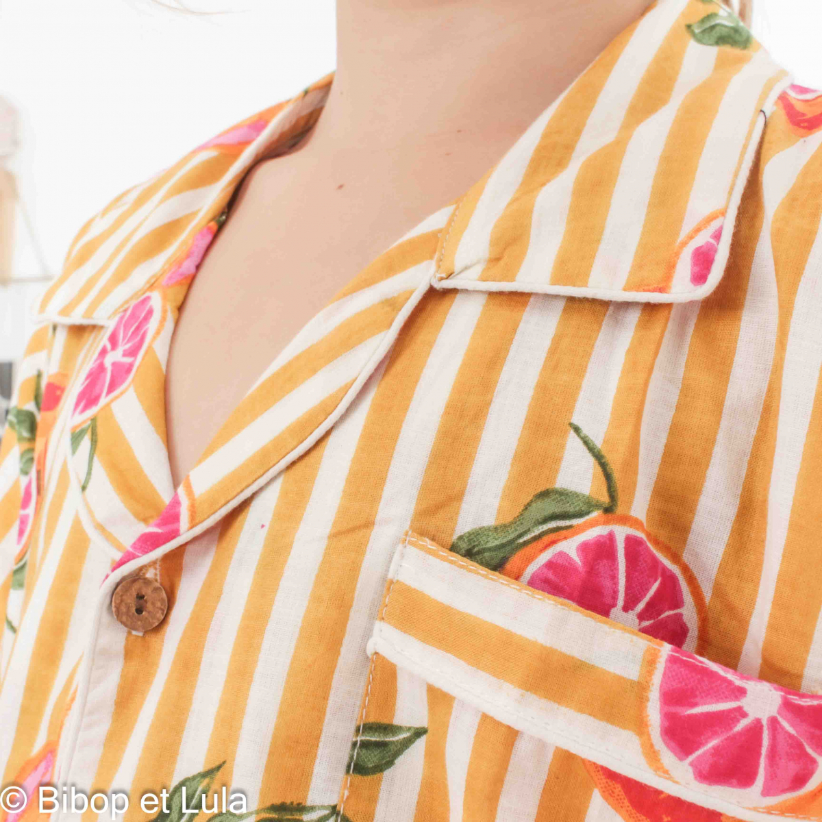 Les finitions avec un joli biais et les boutons en bambou témoignent d’un soin particulier apporté aux détails, alliant esthétique et durabilité.