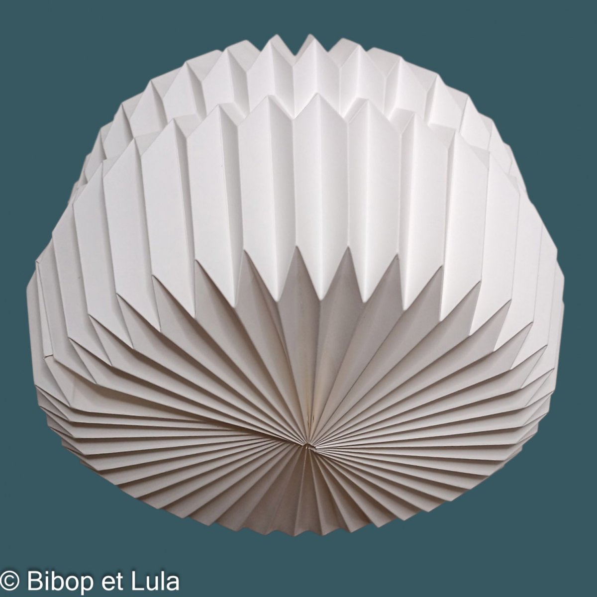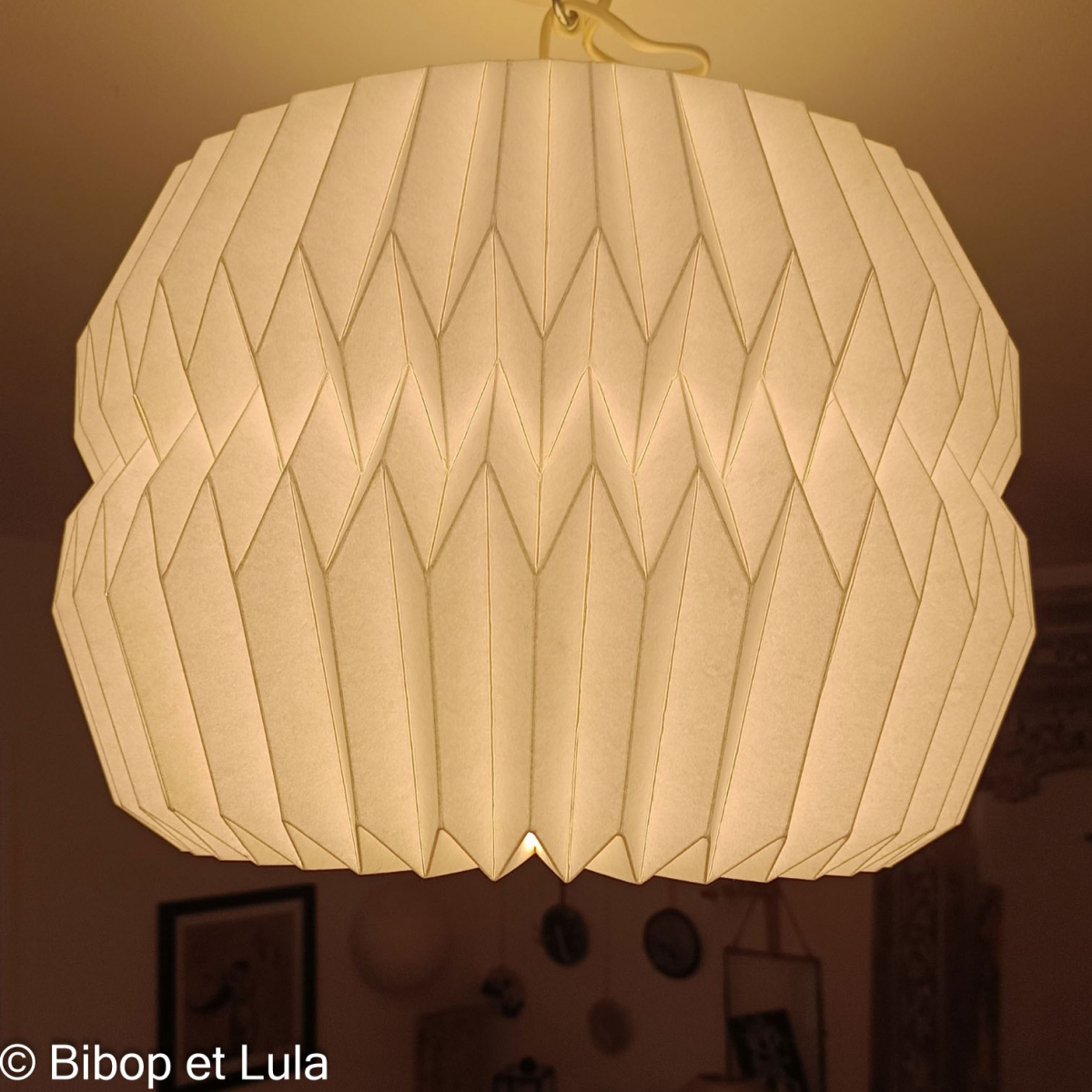 Sa structure en papier rigide laisse passer une lumière douce et diffuse, idéale pour créer une ambiance chaleureuse dans une chambre, un salon ou une entrée.