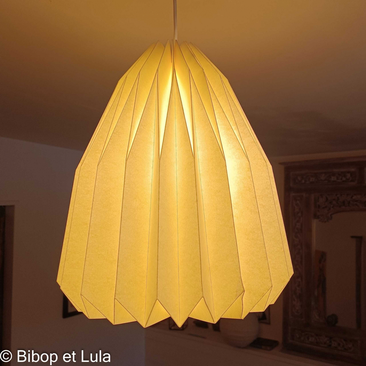 Sa structure en papier rigide laisse passer une lumière douce et diffuse, idéale pour créer une ambiance chaleureuse dans une chambre, un salon ou une entrée.