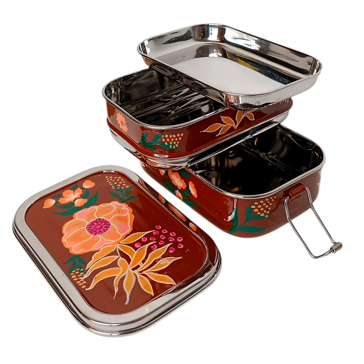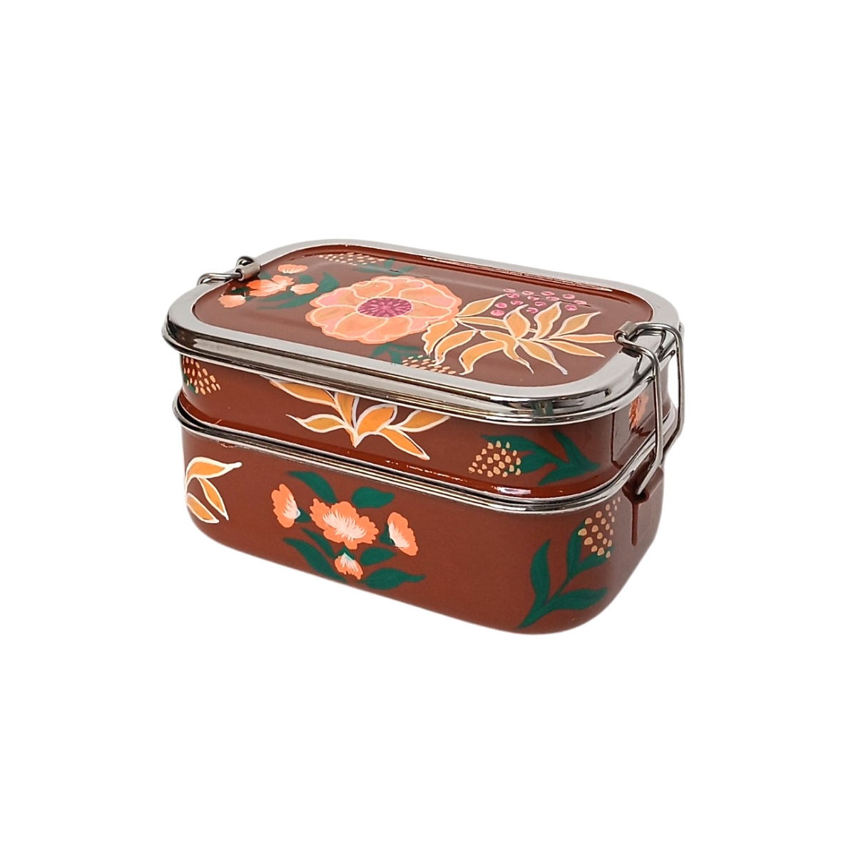 Découvrez l’élégance artisanale de notre boîte bento Mandi, peinte à la main. Revêtue d’un brun chaleureux, elle est décorée de motifs floraux aux tons orangés, verts et crème, qui apportent une touche naturelle et raffinée.