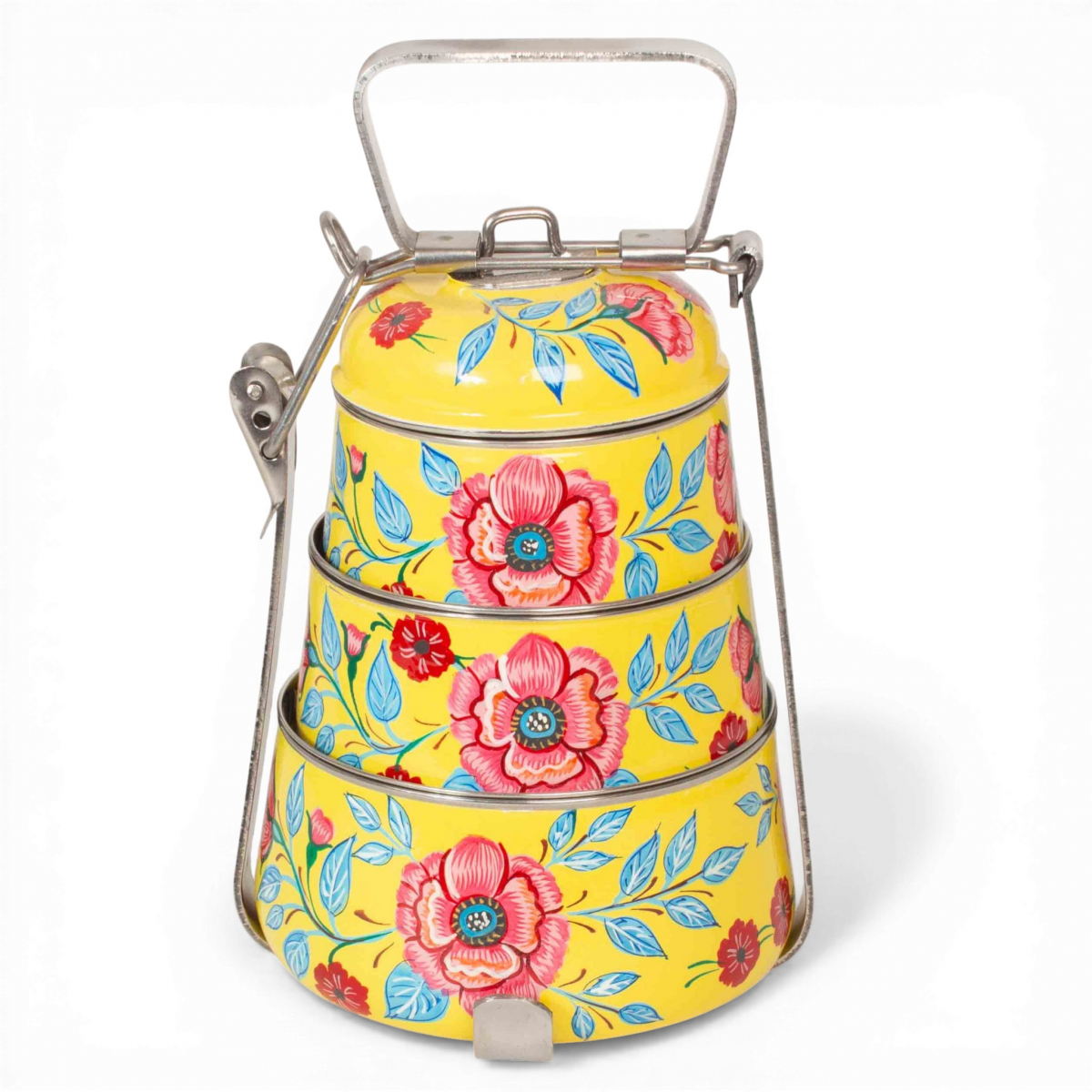 Offrez-vous notre lunch box Surya, peinte à la main jaune éclatant avec feuillage bleu. Polyvalente et stylée, cette lunch box est un choix parfait pour emporter vos repas avec vous tout en ajoutant une touche de charme à votre routine alimentaire.