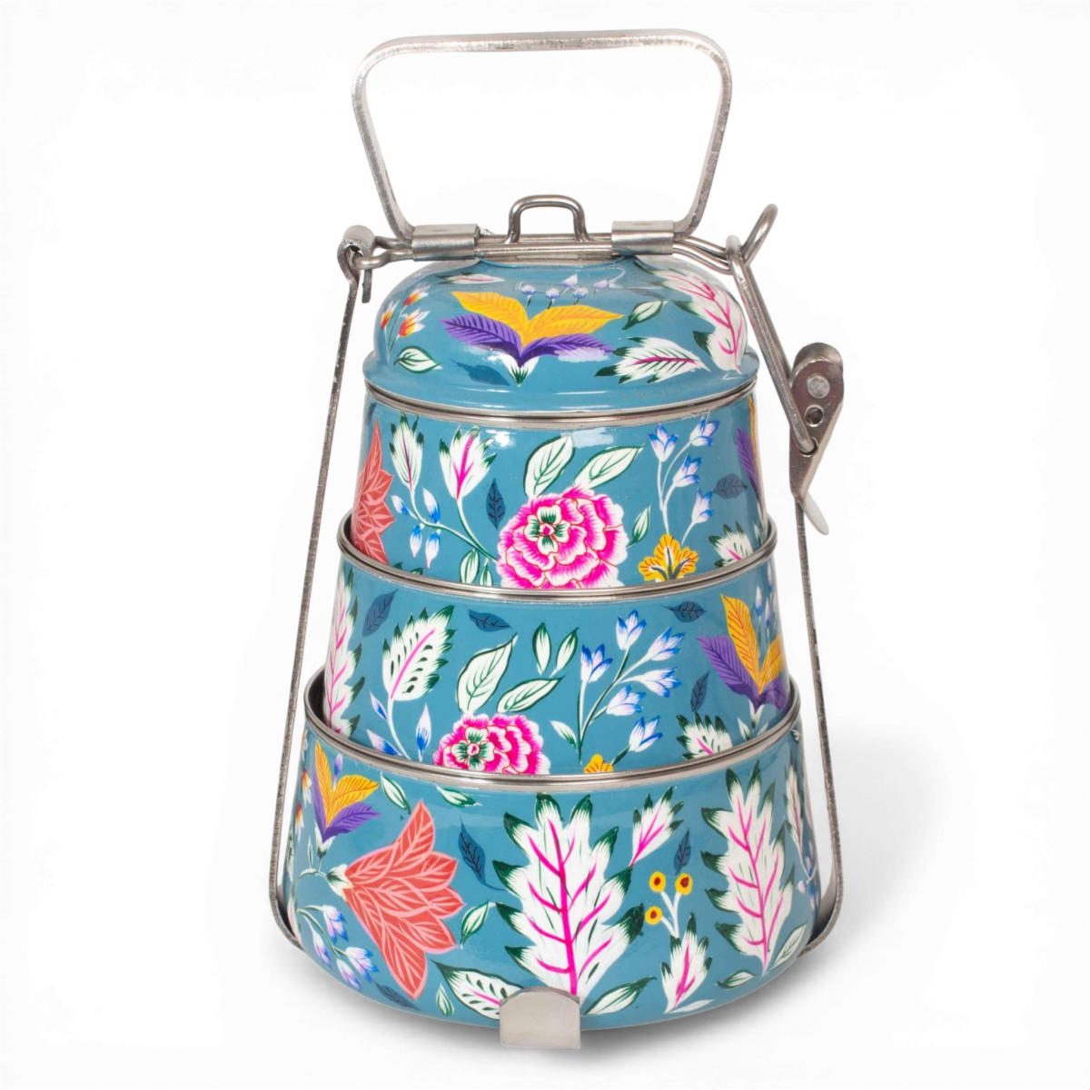 Offrez-vous notre lunch box Pondichery, peinte à la main dans un doux bleu turquoise avec des motifs de fleurs orangées. Polyvalente et stylée, cette lunch box est un choix parfait pour emporter vos repas avec vous tout en ajoutant une touche de charme à votre routine alimentaire.