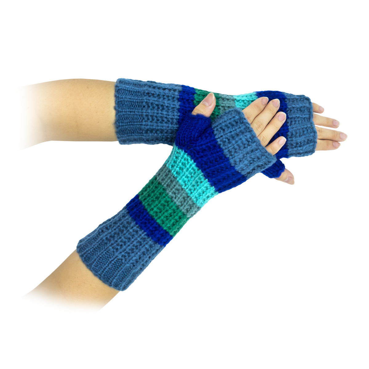 Apportez une touche de couleur et de chaleur à vos journées d’hiver avec ces mitaines rayées en laine. Leur tricot épais alterne des bandes de bleu, vert et turquoise, pour un style dynamique et moderne.