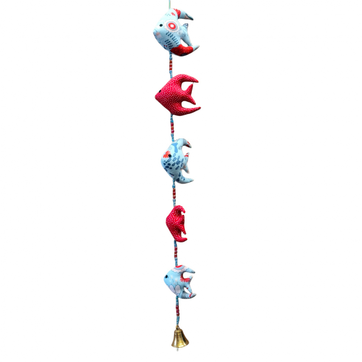 Mobile déco Poissons rouges composé de perles colorées, d'une clochette et de jolies figurines en tissu.