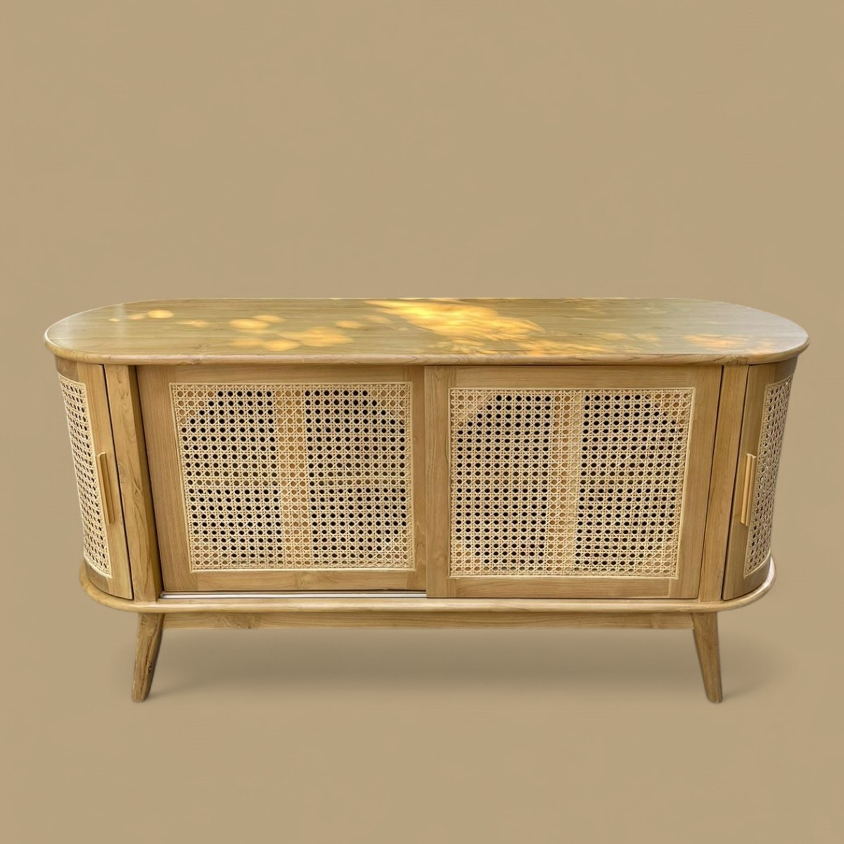 Apportez une touche d’élégance naturelle à votre intérieur avec ce buffet bas en teck massif et en rotin, fabriqué artisanalement en mini-série par Reeza, artisan sur l’île de Java en Indonésie. Chaque pièce est unique et reflète le savoir-faire traditionnel indonésien.