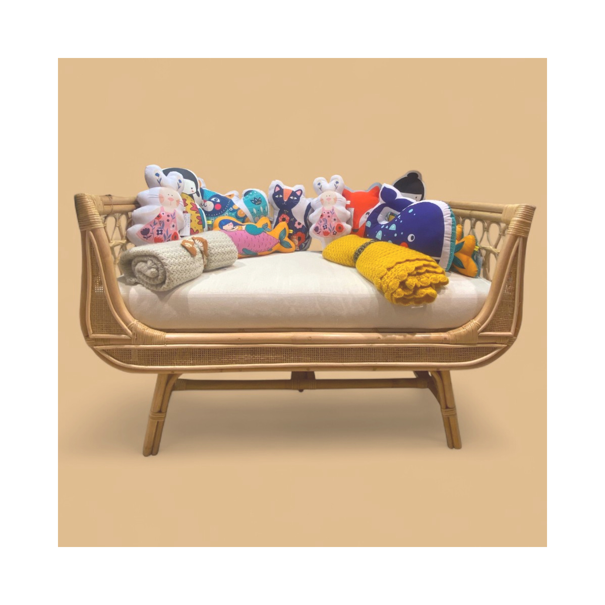 Elle peut être utilisée comme petit canapé d’appoint, banquette décorative ou assise pratique dans un intérieur au style bohème chic, scandinave ou vintage naturel.