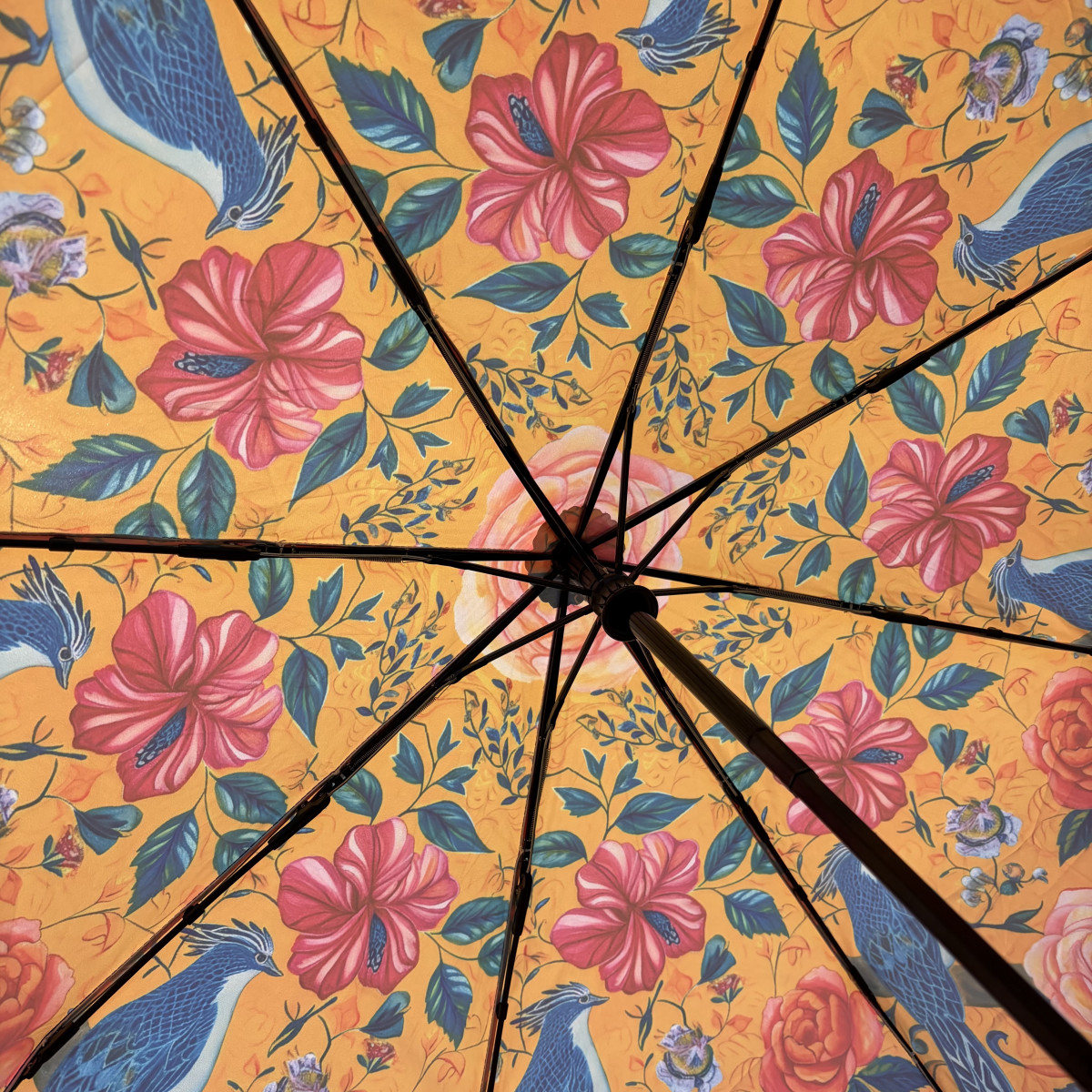 Avec son fond jaune éclatant et ses oiseaux bleus entourés de fleurs, le parapluie pliant Surya apporte instantanément de la couleur aux journées grises. Son tissu déperlant et imperméable, ainsi que sa conception solide et son bouton d'ouverture automatique assure une utilisation facile et rapide au quotidien. Facile à transporter grâce à son format pliant, il se range rapidement dans sa housse pour protéger vos affaires une fois la pluie passée.