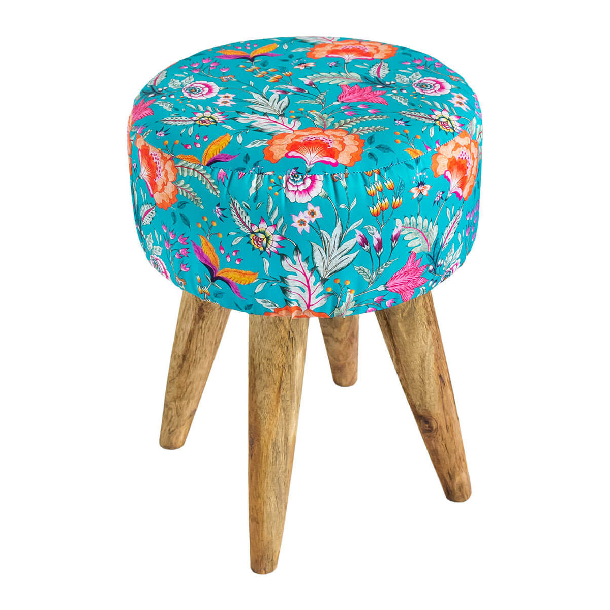 Tabouret rond tissu imprimé bleu ciel imprimé fleuri coloré