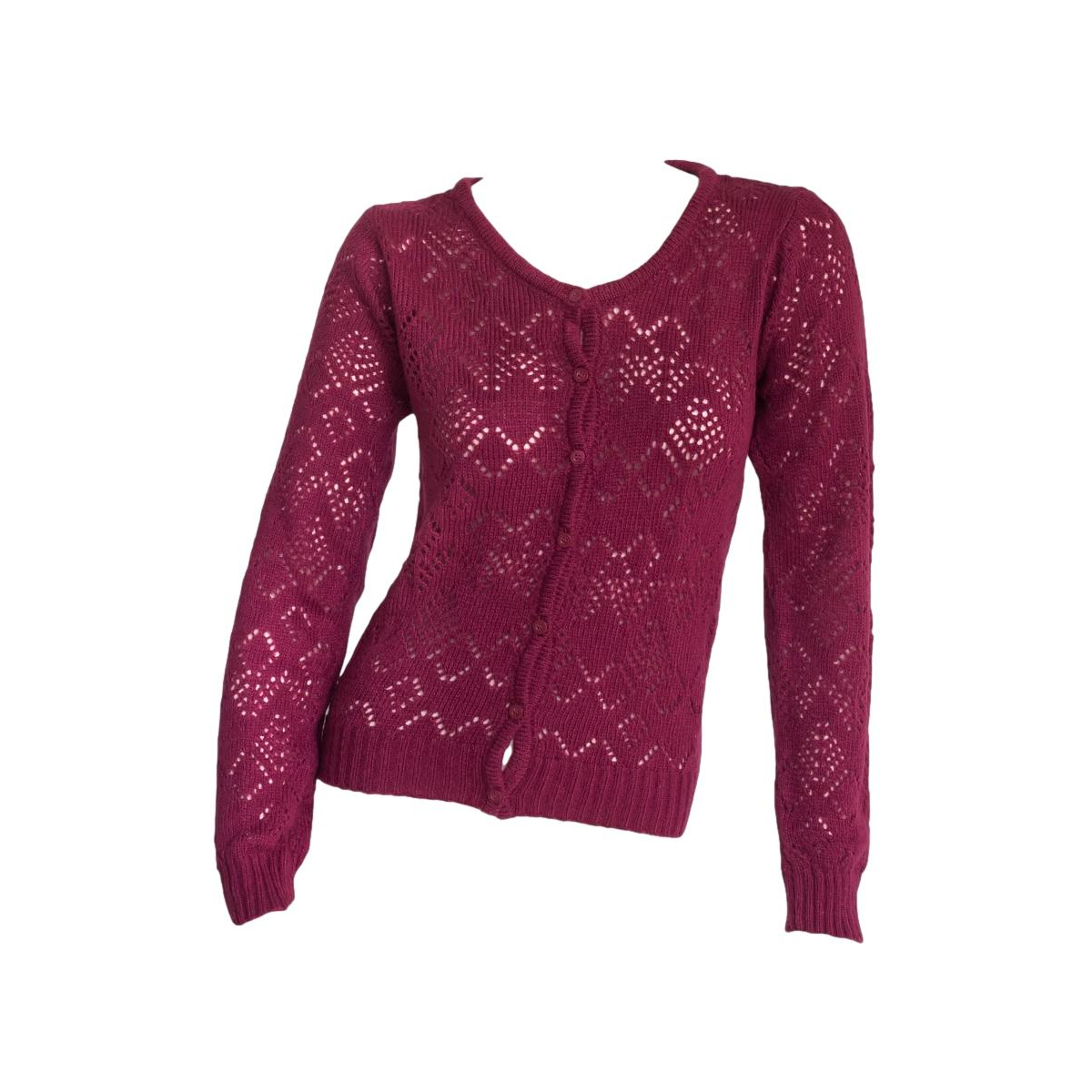 Apportez une touche de douceur et d’élégance à votre dressing avec ce gilet en laine ajourée pour femme, au coloris bordeaux profond.