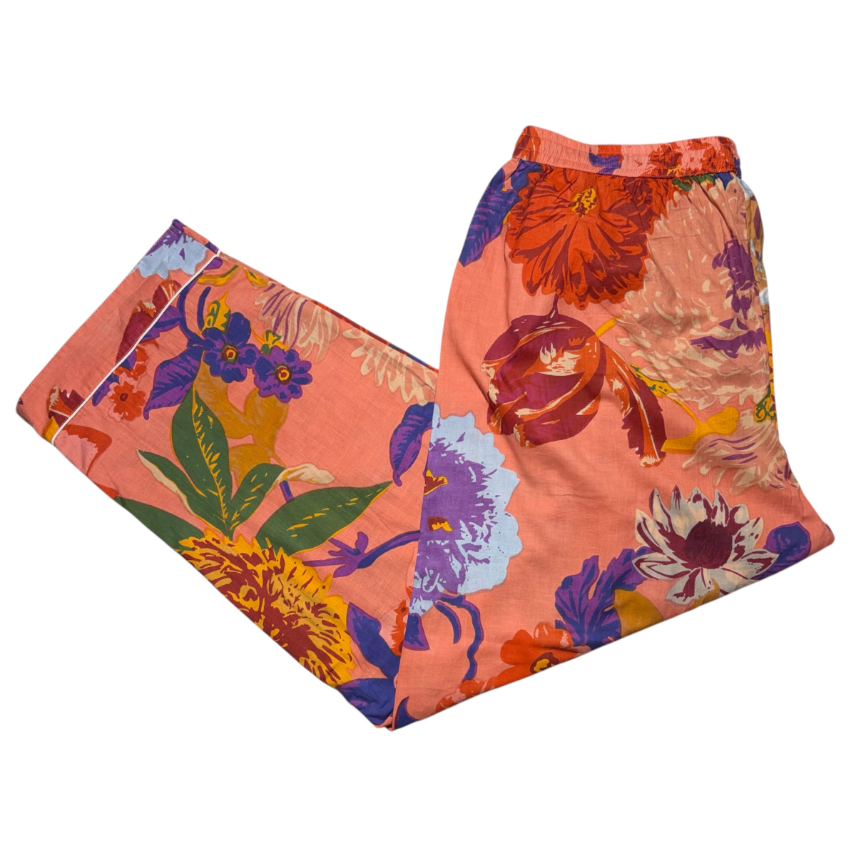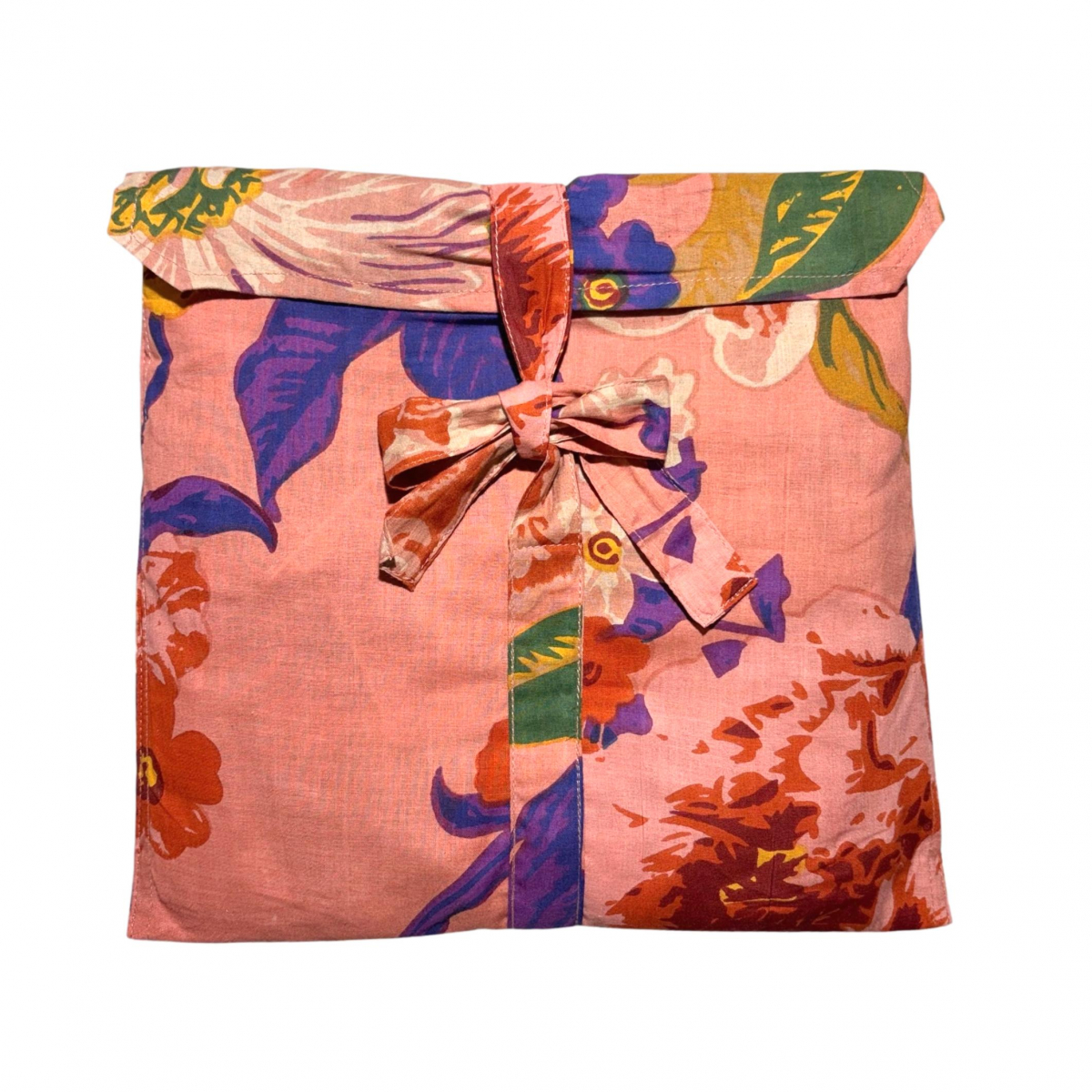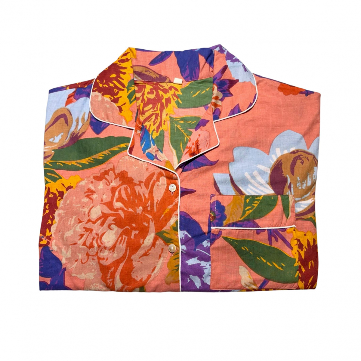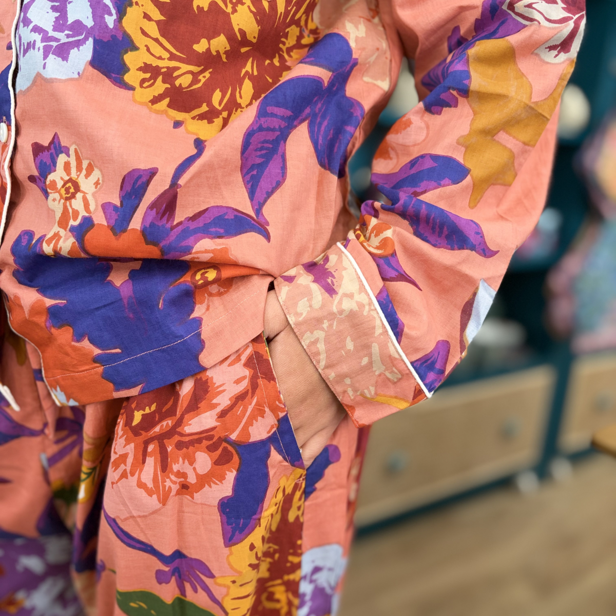 Confectionné en coton tout doux, il séduit par son imprimé à grosses fleurs dans des tons rose orangés et violet.