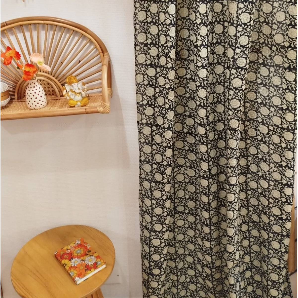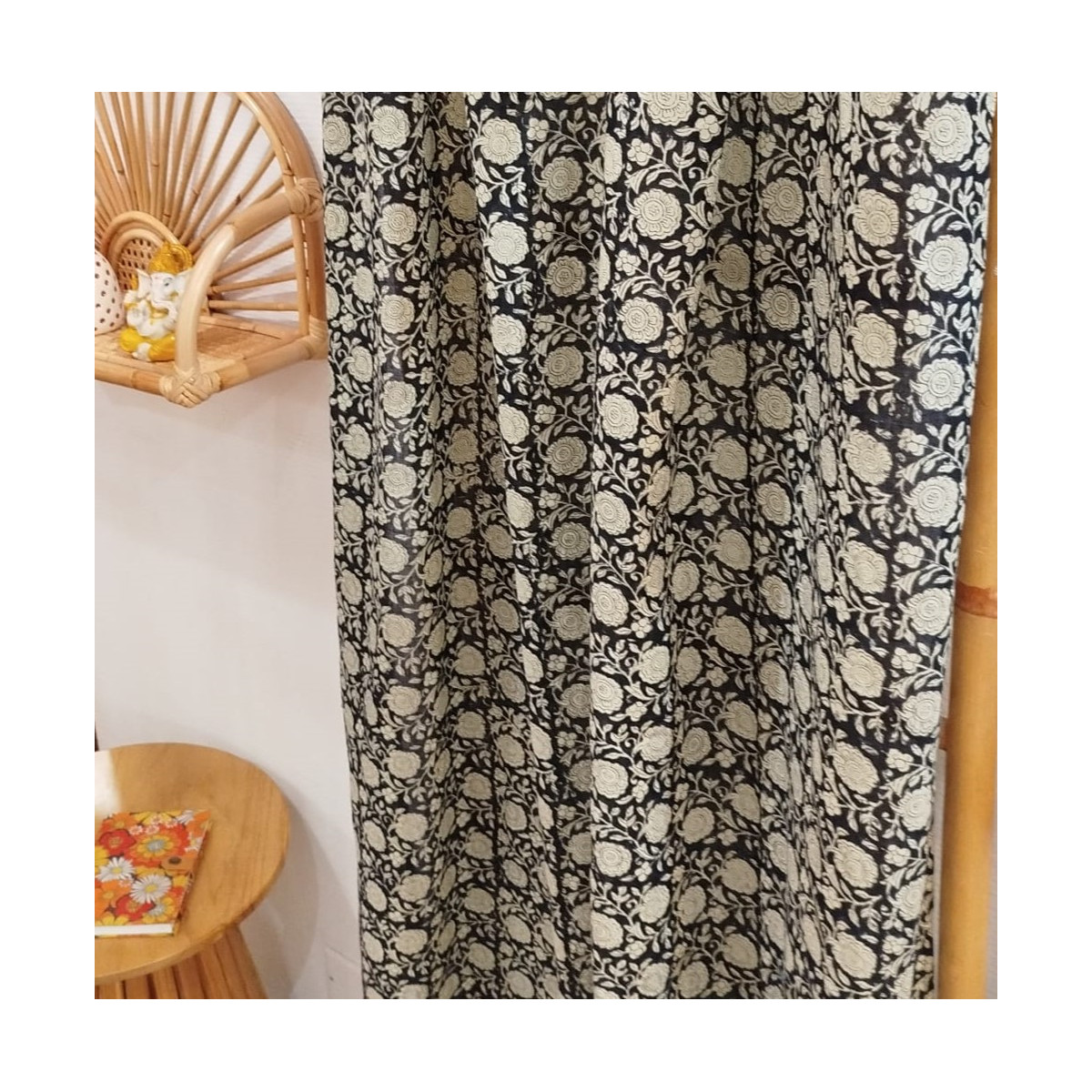 Léger et élégant, il diffuse joliment la lumière tout en habillant vos fenêtres d’un motif floral crème sur fond noir inspiré des imprimés artisanaux indiens.