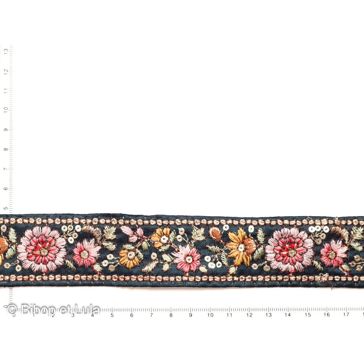 Ce joli galon floral brodé de fils dorés et de sequins dorés sur un fond vert sapin égaiera vos créations.